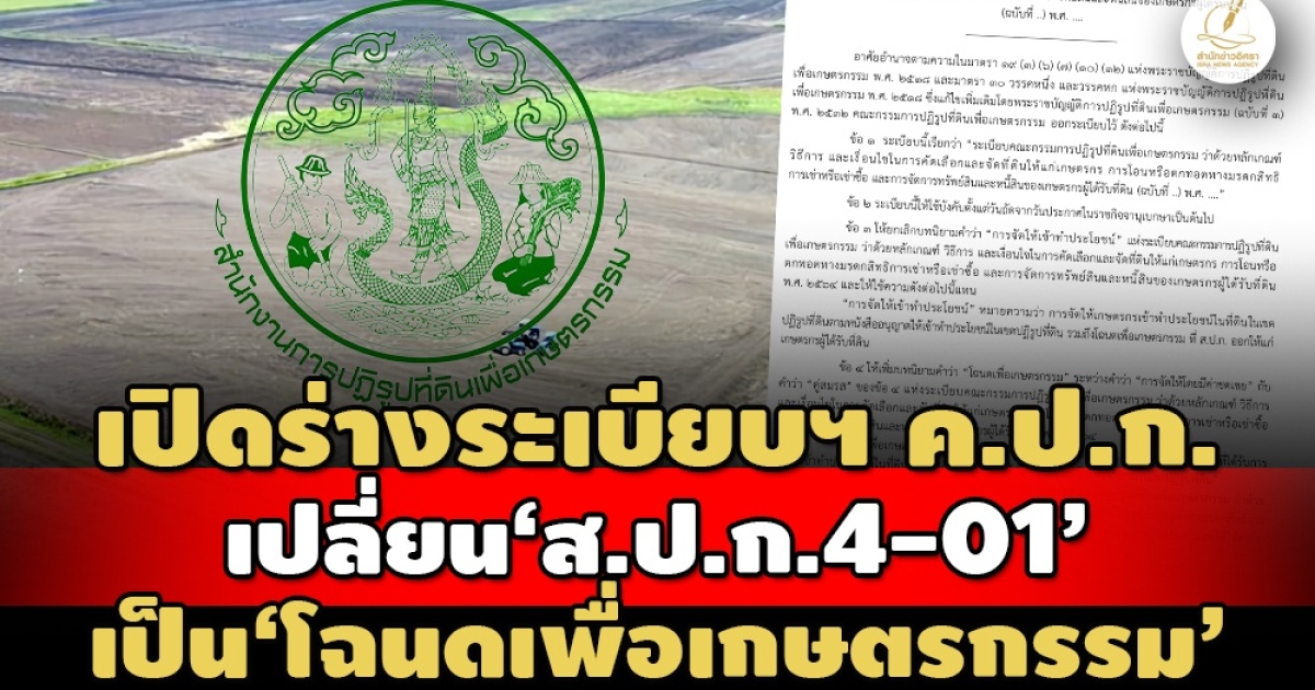 ทั้งนี้ ในส่วนหลักเกณฑ์และวิธีการในการปรับปรุงเอกสารสิทธิ ‘ส.ป.ก. 4-01’ ไปเป็น ‘โฉนดเพื่อเกษตรกรรม’ รวมถึงแนวทางการอนุญาตให้สามารถนำ ‘โฉนดเพื่อเกษตรกรรม’ ไป ‘ซื้อขาย-เปลี่ยนมือ’ ได้ นั้น
