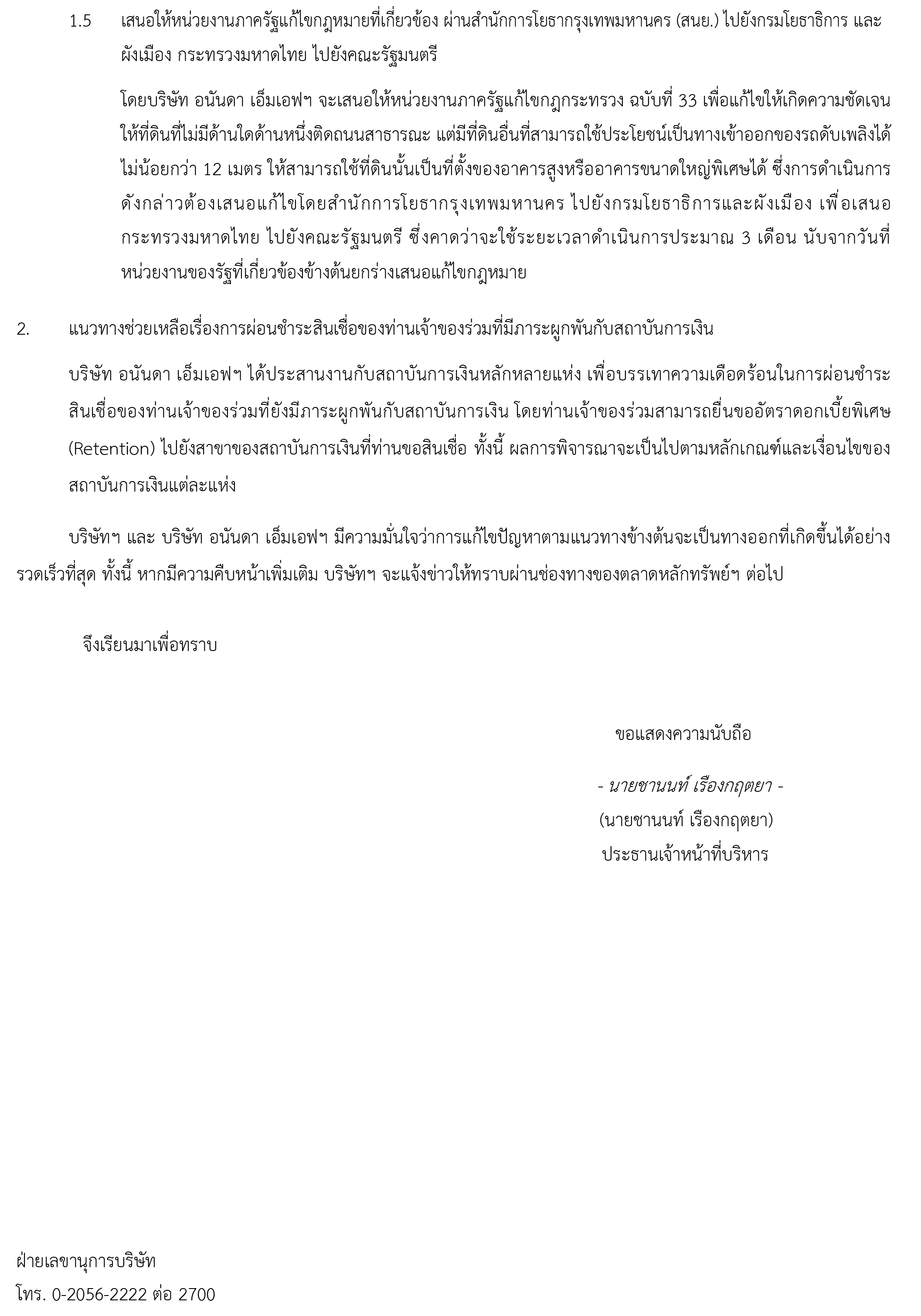 ท่ามกลางความพยายามของ บริษัท อนันดา เอ็มเอฟฯ ในการเสนอให้หน่วยงานภาครัฐแก้ไขกฎกระทรวง ฉบับที่ 33 เพื่อแก้ไขให้เกิดความชัดเจน ให้ที่ดินที่ไม่มีด้านใดด้านหนึ่งติดถนนสาธารณะ แต่มีที่ดินอื่นที่สามารถใช้ประโยชน์เป็นทางเข้าออกของรถดับเพลิงได้ไม่น้อยกว่า 12 เมตร ให้สามารถใช้ที่ดินนั้นเป็นที่ตั้งของอาคารสูงหรืออาคารขนาดใหญ่พิเศษได้