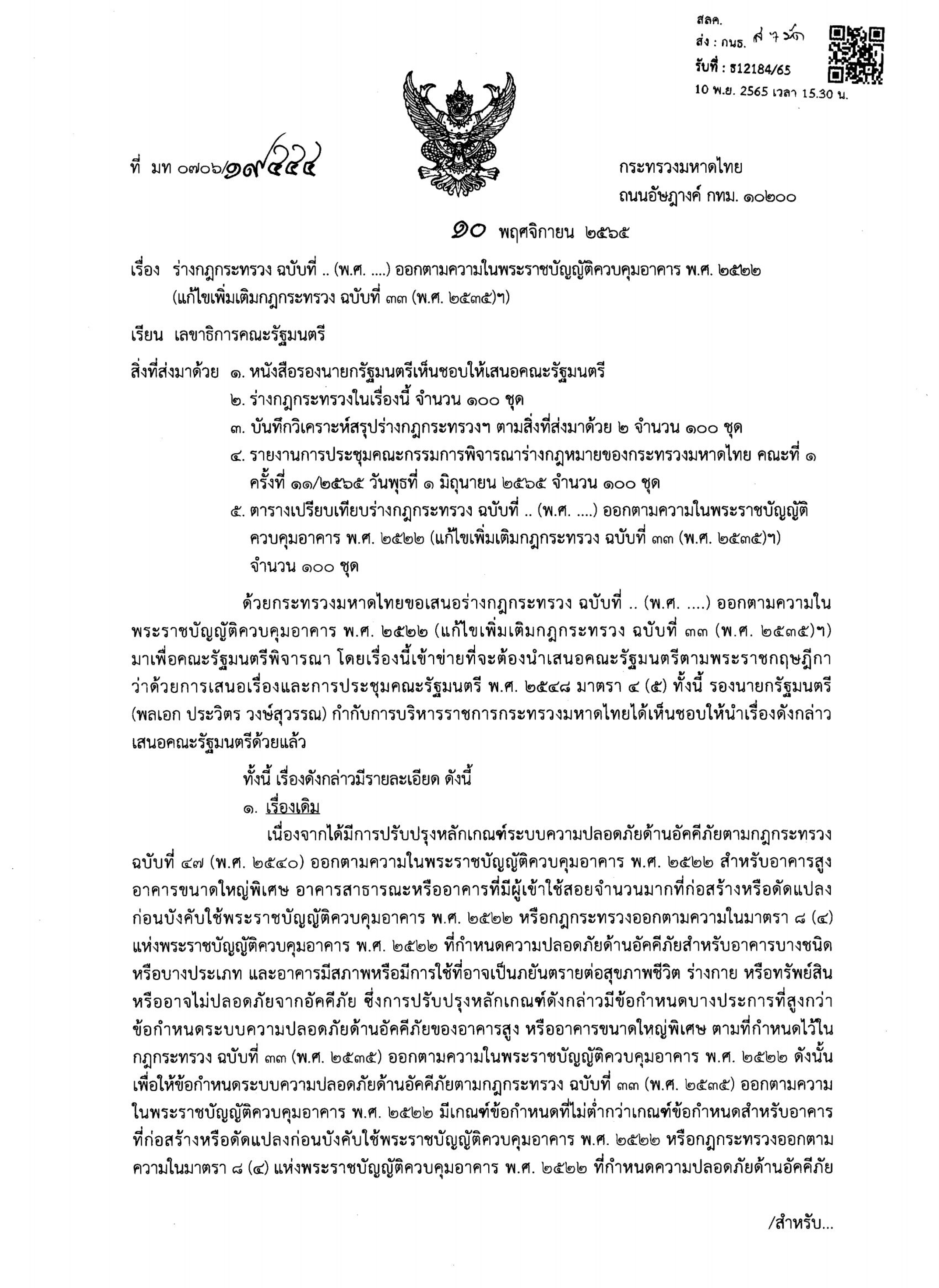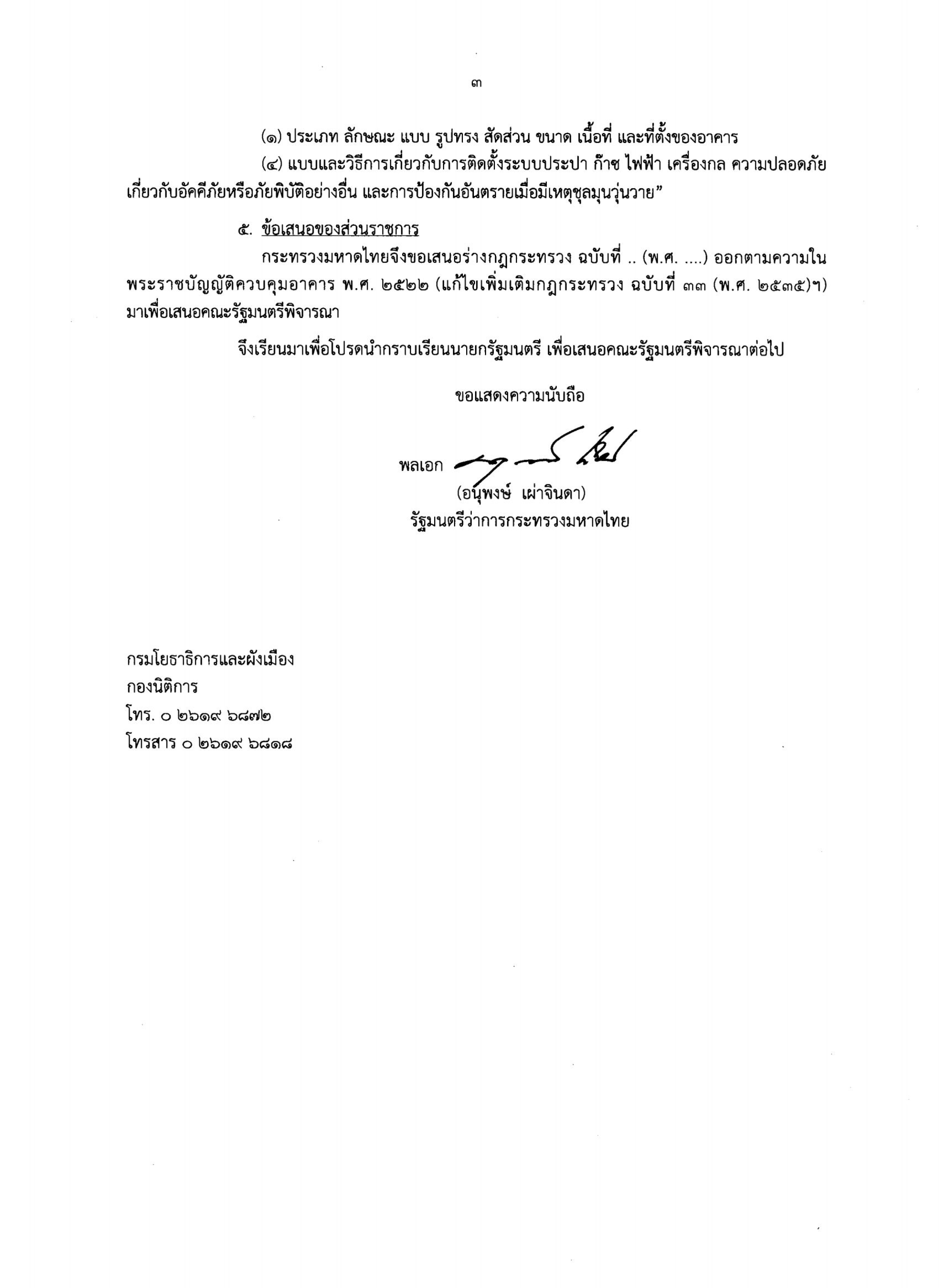 ‘บิ๊กป๊อก’ พล.อ.อนุพงษ์ เผ่าจินดา รมว.มหาดไทย ในขณะนั้น ได้เสนอร่างกฎกระทรวง ฉบับที่ ... (พ.ศ. ....) ออกตามความในพระราชบัญญัติควบคุมอาคาร พ.ศ.2522 (แก้ไขเพิ่มเติมกฎกระทรวง ฉบับที่ 33 (พ.ศ.2535)ฯ) ให้ ครม.พิจารณา และ ครม.มีมติ ‘อนุมัติหลักการ’ และส่งร่างกฎกระทรวงฯไปให้สำนักงานคณะกรรมการกฤษฎีกาตรวจพิจารณา
