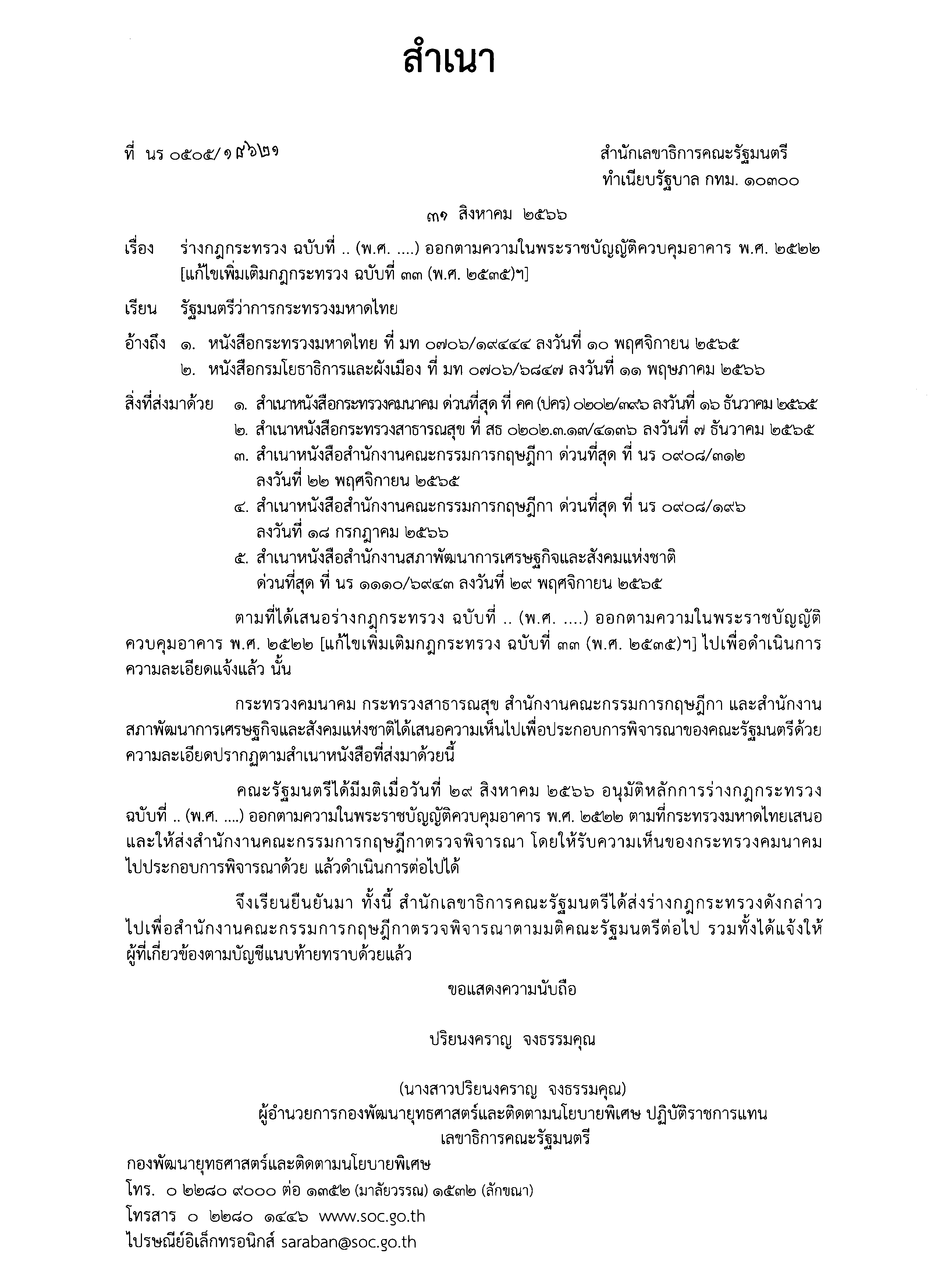 และให้ส่งสำนักงานคณะกรรมการกฤษฎีกาตรวจพิจารณา โดยให้รับความเห็นของกระทรวงคมนาคมไปประกอบการพิจารณาด้วย แล้วดำเนินการต่อไปได้” หนังสือสำนักเลขาธิการคณะรัฐมนตรี ที่ นร. 0505/18621 ลงวันที่ 31 ส.ค.2566 ระบุ