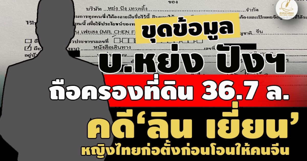 ขุดข้อมูล บ.ที่สอง! ‘หย่ง ปัง เทรดดิ้ง’ถือครองที่ดิน 1 แปลง 36.7 ล. คดี‘ลิน เยี่ยน’ ฟอกเงิน ลอบขนเหล้าบุหรี่หนีภาษี ถูกปปง.ยึดอายัดทรัพย์ 31 รายการ 241.7 ล. พบหญิงสาวไทยวัย 36 ปีก่อตั้งถือหุ้นใหญ่ 49% ช่วงเดียวกับ ‘ซิโน แปซิฟิก บริดจ์’ 3 เดือน โอนต่อให้ ‘ซู หัง-เฉิน เฟยสง’ บุคคลสัญชาติจีน