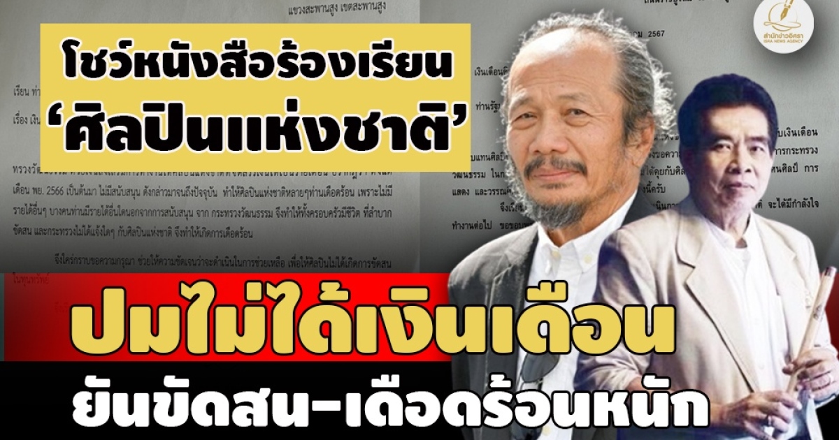 เปิดชัดๆ หนังสือร้องเรียน 'ศิลปินแห่งชาติ' ไม่ได้รับเงินค่าตอบแทนจนครอบครัวเดือดร้อนหนัก-ขัดสน เผยไม่เคยได้แจ้งเหตุผลใดๆ จากกระทรวงวัฒนธรรม ขอความเมตตาเร่งรัดเบิกจ่าย