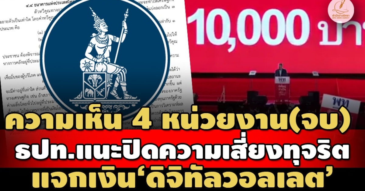 ทั้งนี้ ใน 2 ตอนที่แล้ว สำนักข่าวอิศรา ได้นำเสนอความคิดเห็นของหน่วยงานในสังกัดของกระทรวงการคลัง 4 หน่วยงาน และสำนักงานสภาพัฒนาการเศรษฐกิจและสังคมแห่งชาติ (สศช.) หรือ ‘สภาพัฒน์’ แล้ว โดยในตอนสุดท้าย สำนักข่าวอิศรา ขอนำเสนอความคิดเห็นของ ธนาคารแห่งประเทศไทย (ธปท.) และสำนักงบประมาณ ที่ได้ให้ความเห็นกรณีการเติมเงิน 10,000 บาท ผ่าน Digital Wallet ต่อคณะกรรมการฯ มีรายละเอียด ดังนี้