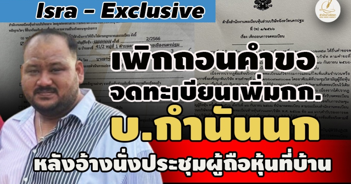 หลัง ‘อิศรา’ตีข่าว! นายทะเบียนหุ้นส่วนบริษัทจ.นครปฐม สั่งเพิกถอนคำขอจดทะเบียน เพิ่มกก. บริษัท ป.รวีกนกฯฉบับ 19 ก.ย.2566 แล้ว ปมหนังสือรับรองอ้าง‘ประวีณ จันทร์คล้าย’นั่งปธ.ประชุมผู้ถือหุ้นที่บ้าน ต.ตาก้อง 16 ก.ย. ทั้งที่ตัวอยู่ในเรือนจำตั้งแต่ 9 ก.ย. ขอให้ส่งเอกสารเกี่ยวข้องชี้แจงข้อเท็จจริง แต่ไม่ทำตาม