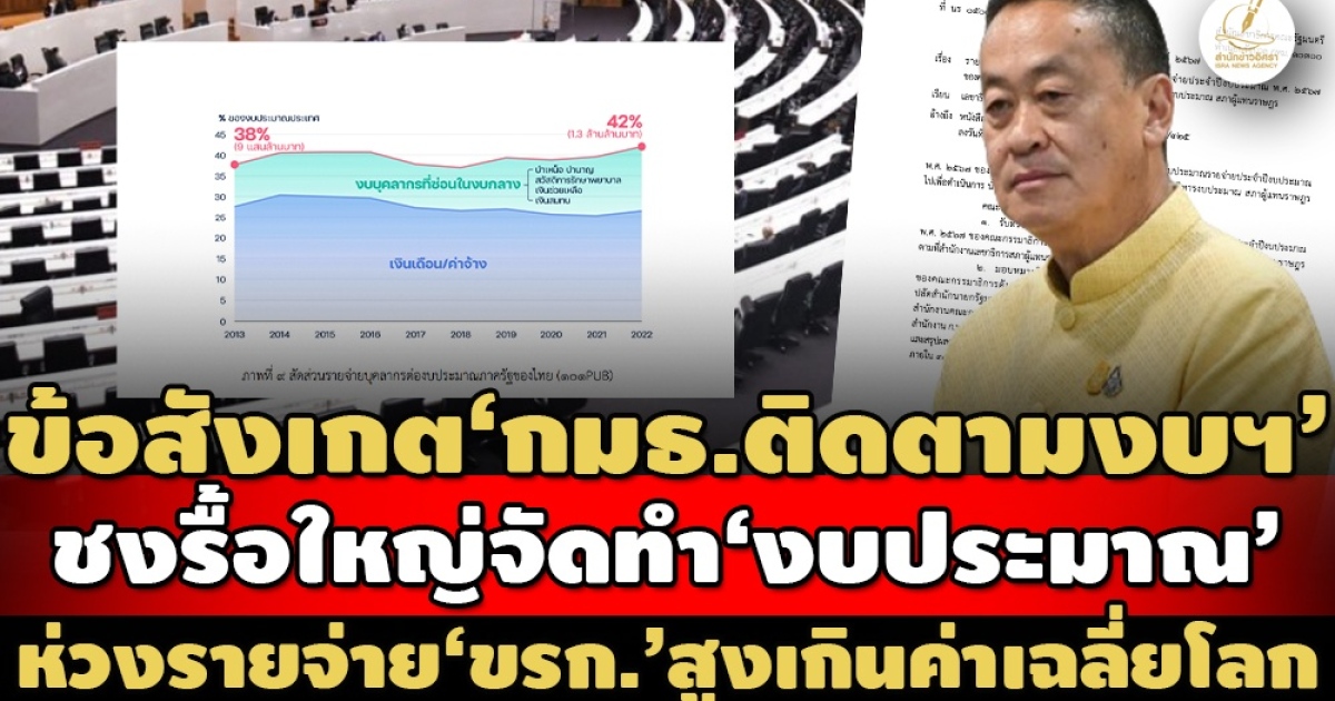 “…สัดส่วนรายจ่ายบุคคลากรต่องบประมาณภาครัฐของไทย (รวมแผนงานบุคคลากรภาครัฐ และค่าใช้จ่ายที่เกี่ยวกับการบริหารงานบุคลากรซ่อนไว้ในงบกลาง ได้แก่ เบี้ยหวัด บำเหน็จ บำนาญ, เงินสำรอง เงินสมทบ และเงินชดเชยของข้าราชการ ฯลฯ) ในปีงบประมาณ พ.ศ.2566 อยู่ที่ร้อยละ 42 ซึ่งมีค่าสูงมากเมื่อเทียบกับมาตรฐานโลกที่มีค่าเฉลี่ย ร้อยละ 19 ประเทศรายได้ปานกลางระดับบนที่มีค่าเฉลี่ยร้อยละ 23.2 เท่านั้น…”