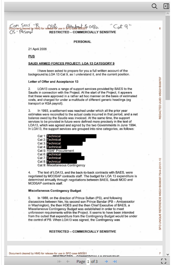 เอกสารนี้ยังย้อนแย้งกับคำกล่าวอ้างที่กินเวลานานกว่าหลายทศวรรษจากทางฝั่งรัฐมนตรีอังกฤษหลายคนว่าไม่มีการทุจริตในข้อตกลงนี้ ซึ่งข้อตกลงนี้ถูกล็อบบี้โดยนางมาการ์เร็ต แทตเชอร์ ในช่วงทศวรรษที่ 80 และมีรายงานว่าเจ้าชายบันดาร์ บุตรของเจ้าชายสุลต่าน รัฐมนตรีว่าการกระทรวงกลาโหมของซาอุดิอาระเบียในเวลานั้นมีบทบาทสำคัญในการเจรจา