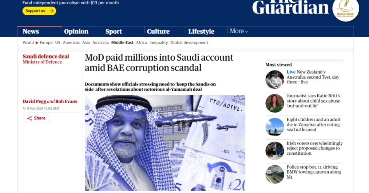 เรียบเรียงจาก:https://www.theguardian.com/world/2024/mar/08/mod-paid-millions-into-saudi-account-amid-bae-corruption-scandal