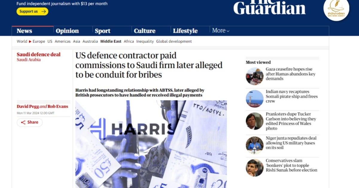 เรียบเรียงจาก:https://www.theguardian.com/world/2024/mar/11/us-defence-contractor-paid-commissions-saudi-firm-later-alleged-conduit-bribes