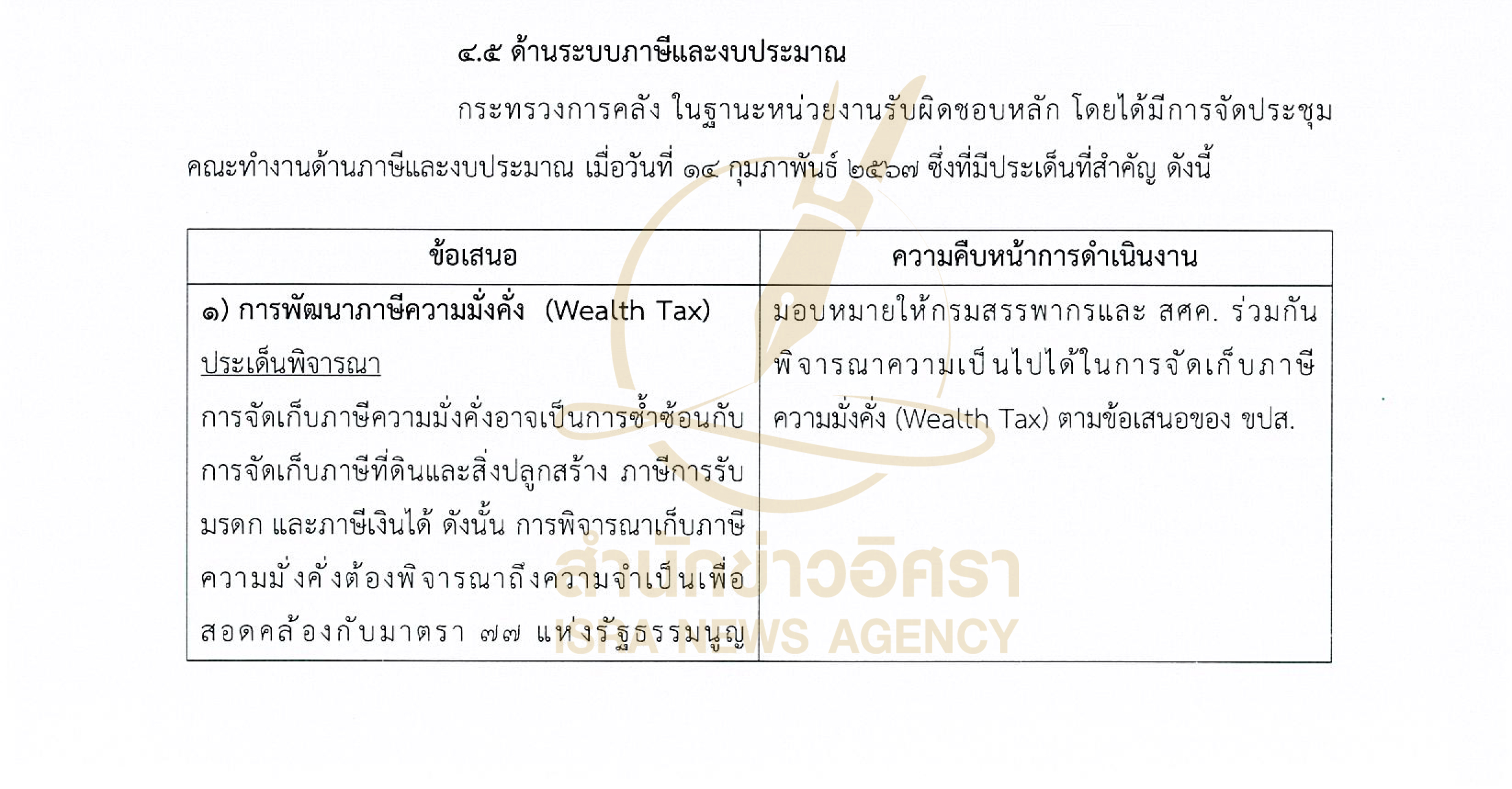 “ได้มีการมอบหมายให้กรมสรรพากร และสำนักงานเศรษฐกิจการคลัง (สศค.) ร่วมกันพิจารณาศึกษาความเป็นไปได้ในการจัดเก็บภาษีความมั่งคั่ง (Wealth Tax) ,การปรับปรุงภาษีการรับมรดก อาทิ ประเด็นการรับมรดกจากบิดามารดาจะเสียภาษีในอัตรา 5% จากส่วนที่เกิน 100 ล้านบาท…”