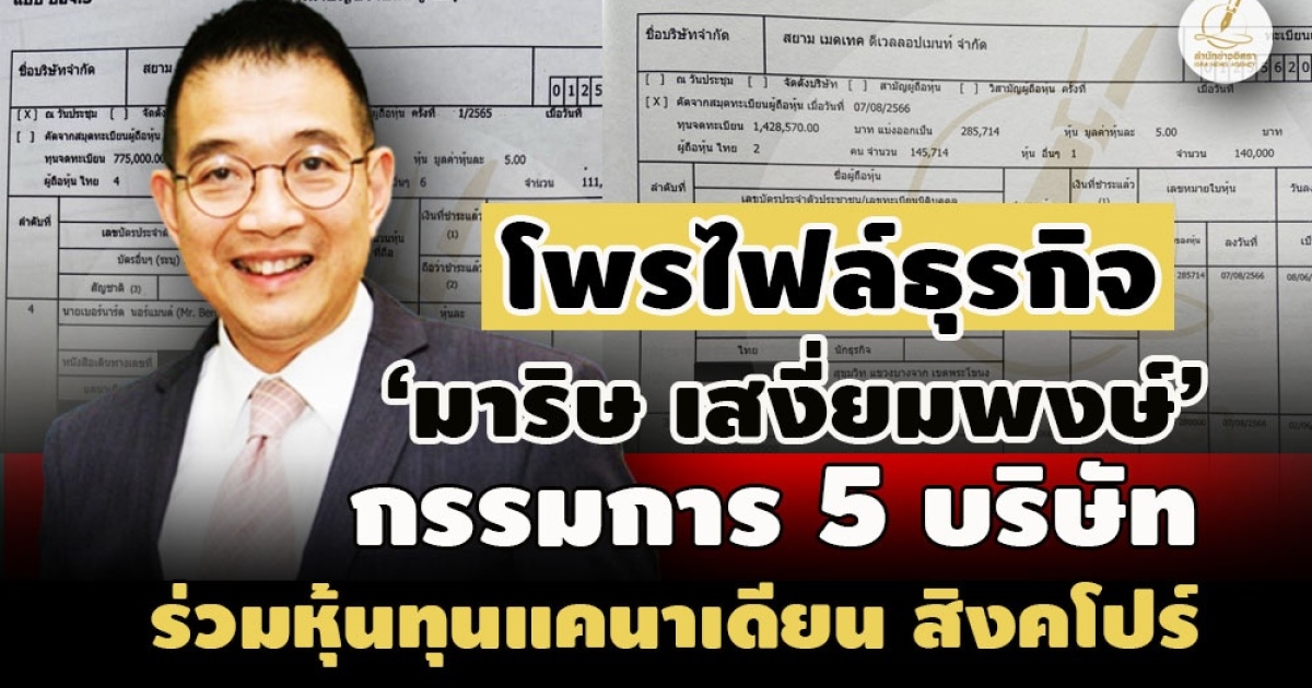4.บริษัท เมต้า รีซอร์สเซส จำกัด จดทะเบียนวันที่ 17 มกราคม 2566 ทุน 200,000 บาท ประกอบกิจการสอนภาษา แปลเอกสาร ย่านพระราม 9 กรุงเทพฯ นายมาริษ ถือ 6,220 หุ้น (31.10%) เมต้า โกลเบิ้ล อินเวสเม้นต์ พีทีอี แอลทีดี จากสิงคโปร์ ร่วมถือหุ้น 24%