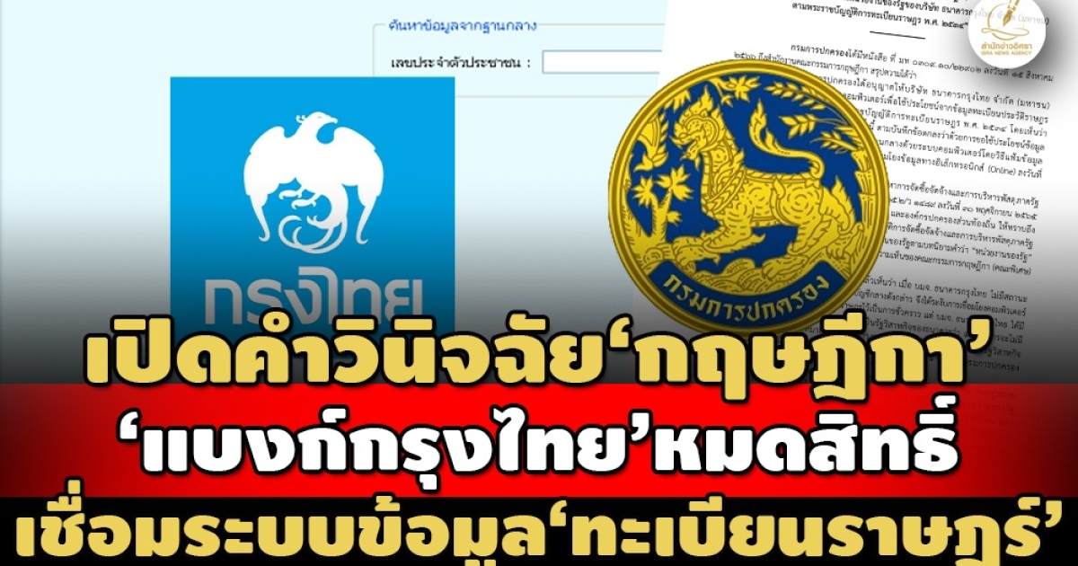 3.กรมการปกครองพิจารณาแล้วเห็นว่า เมื่อ บมจ. ธนาคารกรุงไทย ไม่มีสถานะเป็นหน่วยงานของรัฐตามหนังสือเวียนของกรมบัญชีกลางดังกล่าว จึงได้ระงับการเชื่อมโยงคอมพิวเตอร์เพื่อใช้ประโยชน์จากข้อมูลทะเบียนประวัติราษฎรไว้เป็นการชั่วคราว