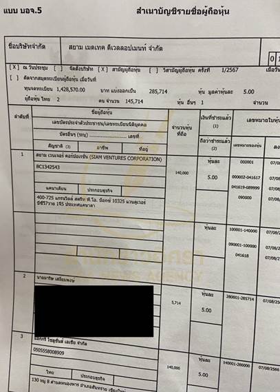 โดยบัญชีรายชื่อผู้ถือหุ้น (บอจ.5) ล่าสุด บริษัทสยาม เมดเทค ดีเวลลอปเมนท์ จำกัด ระบุที่อยู่ ของ สยาม เวนเจอร์ คอร์ปอเรชั่น (ระบุเลขประจำตัวผู้เสียภาษี ฺBC1342543) ที่ตั้งเลขที่ 400-725 แกรนวิลล์ สตรีท เมืองแวนคูเวอร์ ประเทศแคนาดา ซึ่งเลขประจำตัวผู้เสียภาษี BC1342543 และที่ตั้งเลขที่ 400-735 สยาม เวนเจอร์ คอร์ปอเรชั่น ดังกล่าว เป็นเลขประจำตัวผู้เสียภาษีและที่ตั้งเลขที่เดียวกับ สยาม สติ๊ก เวนเจอร์ คอร์ปอเรชั่น (สัญชาติแคนนาเดียน) ที่เป็นผู้ถือหุ้นใหญ่ บริษัท สยาม เมดเทค ดีเวลลอปเมนท์ จำกัด ก่อนหน้านี้