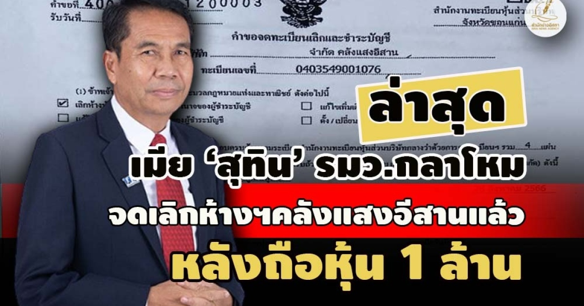 ห้างฯคลังแสงอีสานธุรกิจขายอาหารสัตว์-ให้เช่าที่พัก เมีย ‘สุทิน’ รมว.กลาโหม ยื่นจดเลิกกิจการแล้ว 20 พ.ย. 2566 หลัง ‘อิศรา’รายงานปมลงหุ้น 1 ล. ใช้เงินสด 8 แสนเพิ่มทุน ขณะที่บัญชีทรัพย์สินช่วงเวลาใกล้เคียงแจ้งเงินฝาก 704.02 บ. – ถูก ‘เรืองไกร’ ยื่นสอบคุณสมบัติด้วย