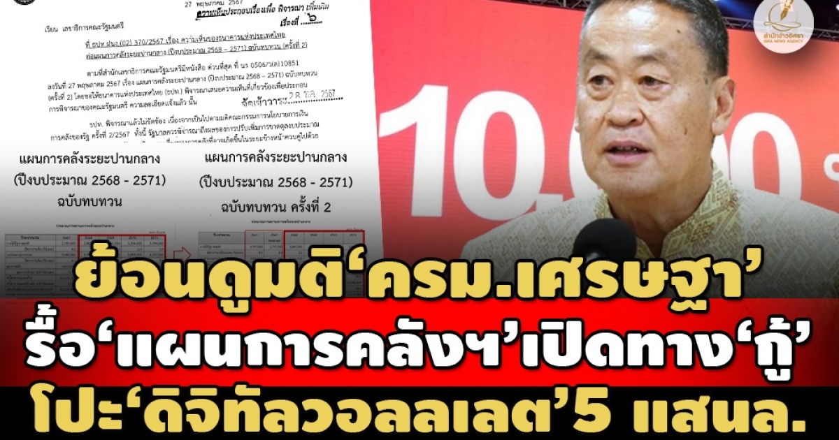 สำนักข่าวอิศรา (www.isranews.org) รายงานว่า นับตั้งแต่คณะรัฐมนตรี (ครม.) เศรษฐา เข้าทำหน้าที่บริหารประเทศ หลังได้รับโปรดเกล้าฯ เมื่อวันที่ 2 ก.ย.2666 รัฐบาลได้มีการทบทวนแผน ‘แผนการคลังระยะปานกลาง’ มาแล้ว 2 ครั้ง เพื่อเปิดทางให้มีการ ‘กู้เงิน’ เพื่อนำมาใช้ในโครงการดิจิทัลวอลเลต