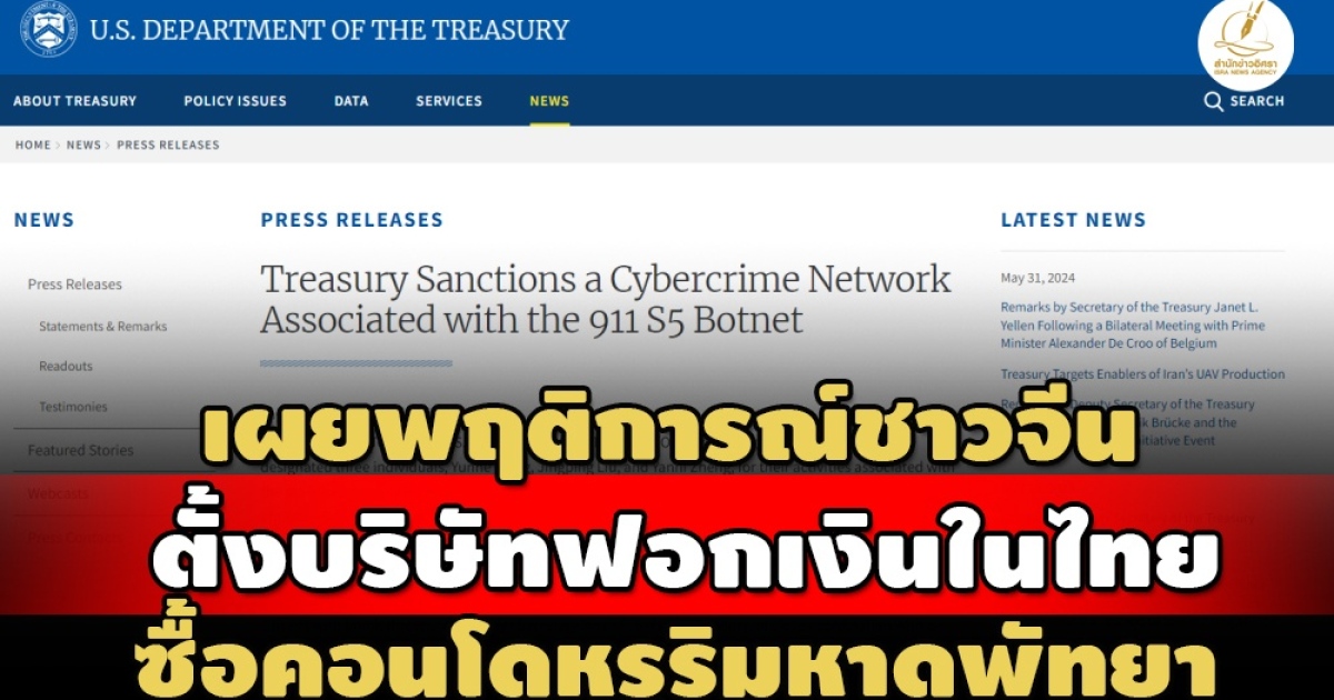 วันนี้ (28 พ.ค.) สํานักงานควบคุมทรัพย์สินต่างประเทศของกระทรวงการคลังสหรัฐอเมริกา (OFAC) ได้กําหนดให้บุคคลสามคน ได้แก่นายหวัง หยุนเหอ (Yunhe Wang) นางหลิว จิงผิง (Jingping Liu) และนายเจิ้ง เหยี่ยนหนี่ (Yanni Zheng) เป็นบุคคลที่เกี่ยวข้องกับบ็อตเน็ตที่เป็นอันตรายซึ่งเชื่อมโยงกับบริการพร็อกซีที่รู้จักกันในชื่อ 911 S5 นอกจากนี้ OFAC ยังได้คว่ำบาตรนิติบุคคล 3 แห่ง ได้แก่ บริษัท สไปซี่ โค้ด จํากัด (Spicy Code Company Limited), บริษัท ทิวลิป บิซ พัทยา กรุ๊ป จํากัด (Tulip Biz Pattaya Group Company Limited) และบริษัท ลิลลี่ สูทส์ จํากัด (Lily Suites Company Limited) เนื่องจากนายหวัง หยุนเหอ เป็นเจ้าของหรือควบคุมนิติบุคคลเหล่านี้
