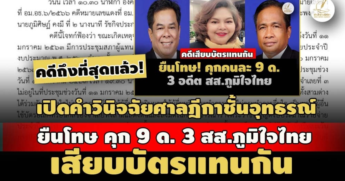 หมายเหตุ สำนักข่าวอิศรา (www.isranews.org) : เป็นบทสรุปคำวินิจฉัยองค์คณะผู้พิพากษาวินิจฉัยอุทธรณ์ ศาลฎีกา คดี อม.อธ.6/2566 อัยการสูงสุด (อสส.) โจทก์ ยื่นฟ้องนายฉลอง เทิดวีระพงศ์ อดีต ส.ส.เขต 2 พัทลุง พรรคภูมิใจไทย, นายภูมิศิษฏ์ คงมี อดีต ส.ส.เขต 1 พัทลุง พรรคภูมิใจไทย, นางนาที รัชกิจประการ อดีต ส.ส.บัญชีรายชื่อ พรรคภูมิใจไทย เป็นจำเลยที่ 1-3 ตามความผิดพระราชบัญญัติประกอบรัฐธรรมนูญ (พ.ร.ป.) ว่าด้วยการป้องกันและปราบปรามการทุจริต พ.ศ. 2561 กรณีเสียบบัตร ส.ส. แทนกันในการประชุมสภา เมื่อวันที่ 11 มิ.ย.2567 ที่ผ่านมา
