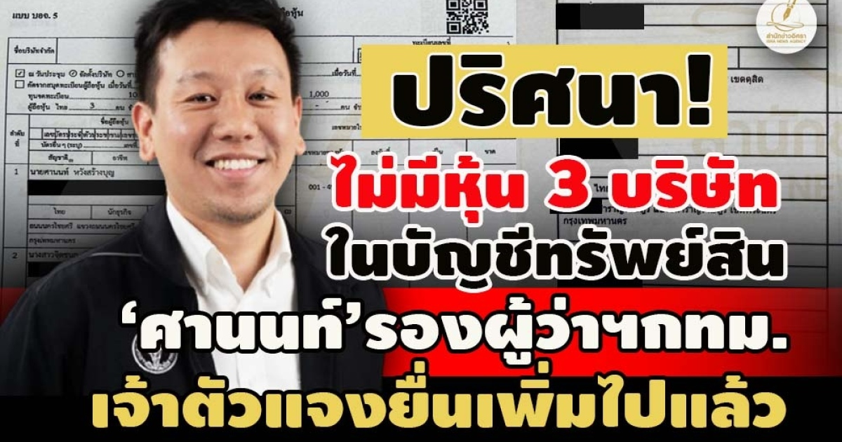 ปริศนา! ไม่พบแจ้งถือครองหุ้นธุรกิจ 3 บริษัท โรงแรม ร้านอาหาร ในบัญชีทรัพย์สิน ‘ศานนท์ หวังสร้างบุญ’ รองผู้ว่ากรุงเทพฯกรณีเข้ารับตำแหน่งมิ.ย.2565 ยื่น ป.ป.ช.มี 7.3 แสนบาท เมีย 7.2 ล. ไร้เงินลงทุน ด้านเจ้าตัวแจงยื่นเพิ่มเติมไปแล้ว