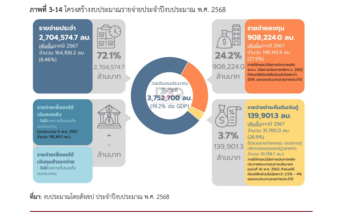 พบว่า ในปีงบประมาณ พ.ศ.2559 ได้กำหนดวงเงินงบประมาณฯ จำนวน 2,720,000 ล้านบาท และในปีงบประมาณ พ.ศ.2568 ได้กำหนดวงเงินงบประมาณฯ จำนวน 3,752,700 ล้านบาท ซึ่งเพิ่มขึ้น 1,032,700 ล้านบาท ภายในระยะเวลา 10 ปี โดยรายจ่ายประจำมีสัดส่วนสูงถึง 3 ใน 4 ในขณะที่รายจ่ายลงทุนมีสัดส่วนเพียง 1 ใน 5 ของวงเงินงบประมาณแต่ละปี