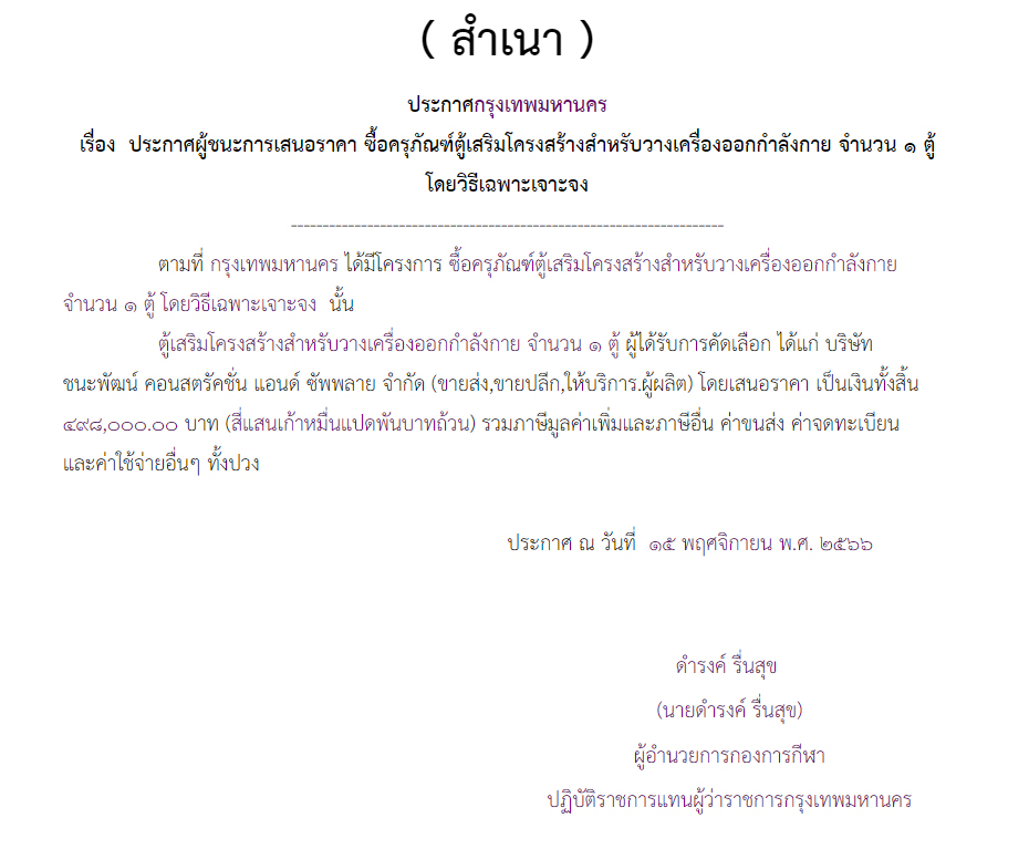 ผู้สื่อข่าวสำนักข่าวอิศรา รายงานว่า จากการสืบค้นฐานข้อมูลจัดซื้อจัดจ้างหน่วยงานภาครัฐ พบว่า เมื่อวันที่ 15 พ.ย.2566 นายดำรงค์ รื่นสุข ผู้อำนวยการกองการกีฬา ปฏิบัติราชการแทนผู้ว่าราชการกรุงเทพมหานคร ได้ลงนามในประกาศผู้ชนะราคา ซื้อครุภัณฑ์ตู้เสริมโครงสร้างสำหรับวางเครื่องออกกำลังกาย จำนวน 1 ตู้ โดยวิธีเฉพาะเจาะจง วงเงิน 498,000 บาท บริษัท ชนะพัฒน์ คอนสตรัคชั่น แอนด์ ซัพพลาย จำกัด ได้รับการคัดเลือก (ดูประกาศ)