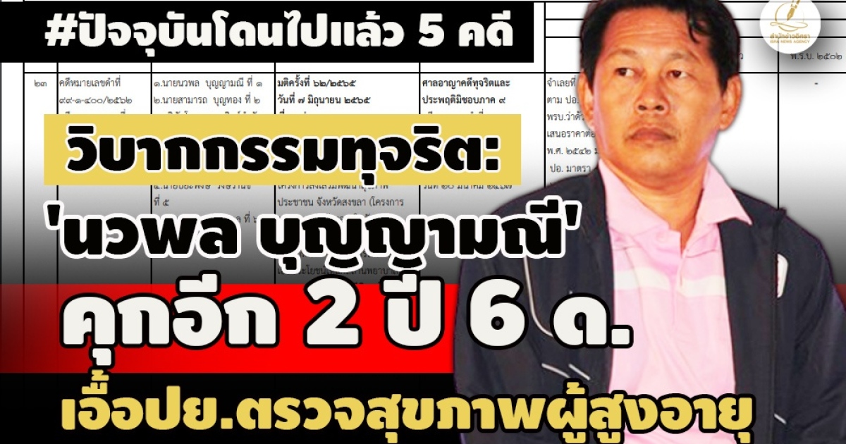 "...นับรวมคดีที่ 5 ล่าสุด การดำเนินโครงการส่งเสริมพัฒนาสุขภาพประชาชน จังหวัดสงขลา (โครงการตรวจสุขภาพผู้สูงอายุในจังหวัดสงขลา) เมื่อปี พ.ศ. 2551- 2552 โดยกำหนดการให้บริการในลักษณะเอื้อประโยชน์ ให้แก่สถานพยาบาลบางราย และจัดจ้างโดยวิธีพิเศษโดยมิชอบ ที่ ศาลอาญาคดีทุจริตและประพฤติมิชอบภาค 9 พิพากษาลงโทษ จำคุก 2 ปี 6 เดือน เท่ากับ นายนวพล ตกเป็นจำเลยเกี่ยวกับคดีทุจริตไปแล้วถึง 5 คดี โทษจำคุกที่ได้รับ มี 7 ปี, 18 ปี 24 เดือน , 2 ปี , 2 ปี และ 2 ปี 6 เดือน ..."