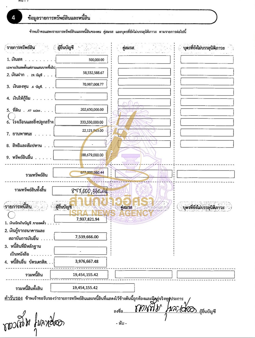 แจ้งมีรายจ่ายต่อปีโดยประมาณ 3,458,376 บาท ประกอบด้วย ค่าอุปโภคบริโภค 1,200,000 บาท ค่าผ่อนรถ 2 คัน 2,138,376 บาท ค่าอุปการะมารดา 120,000 บาท