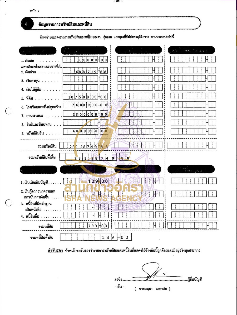 แจ้งมีหนี้สิน 441,608.74 บาท ทั้งหมดเป็นเงินกู้จากธนาคารและสถาบันการเงินอื่น