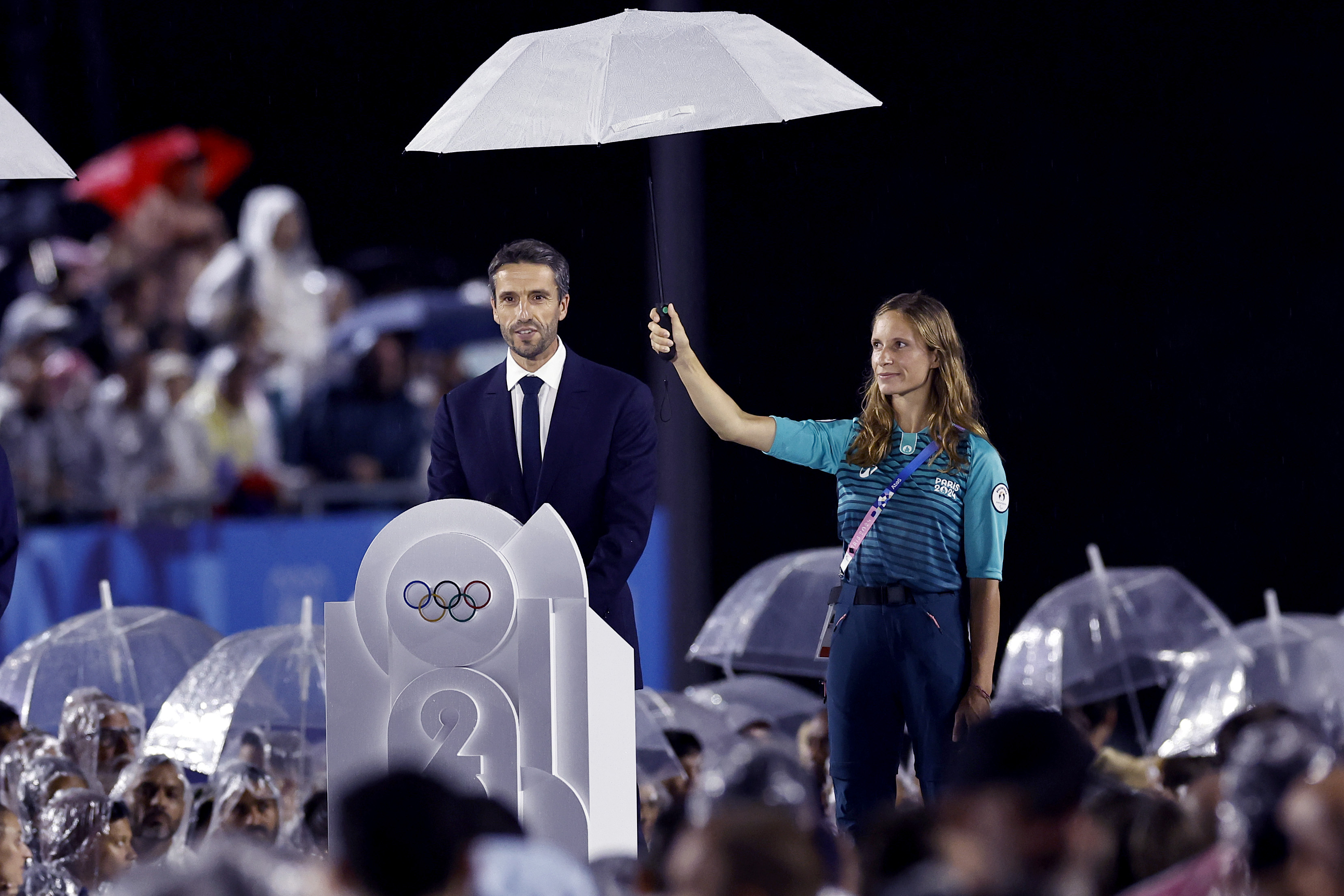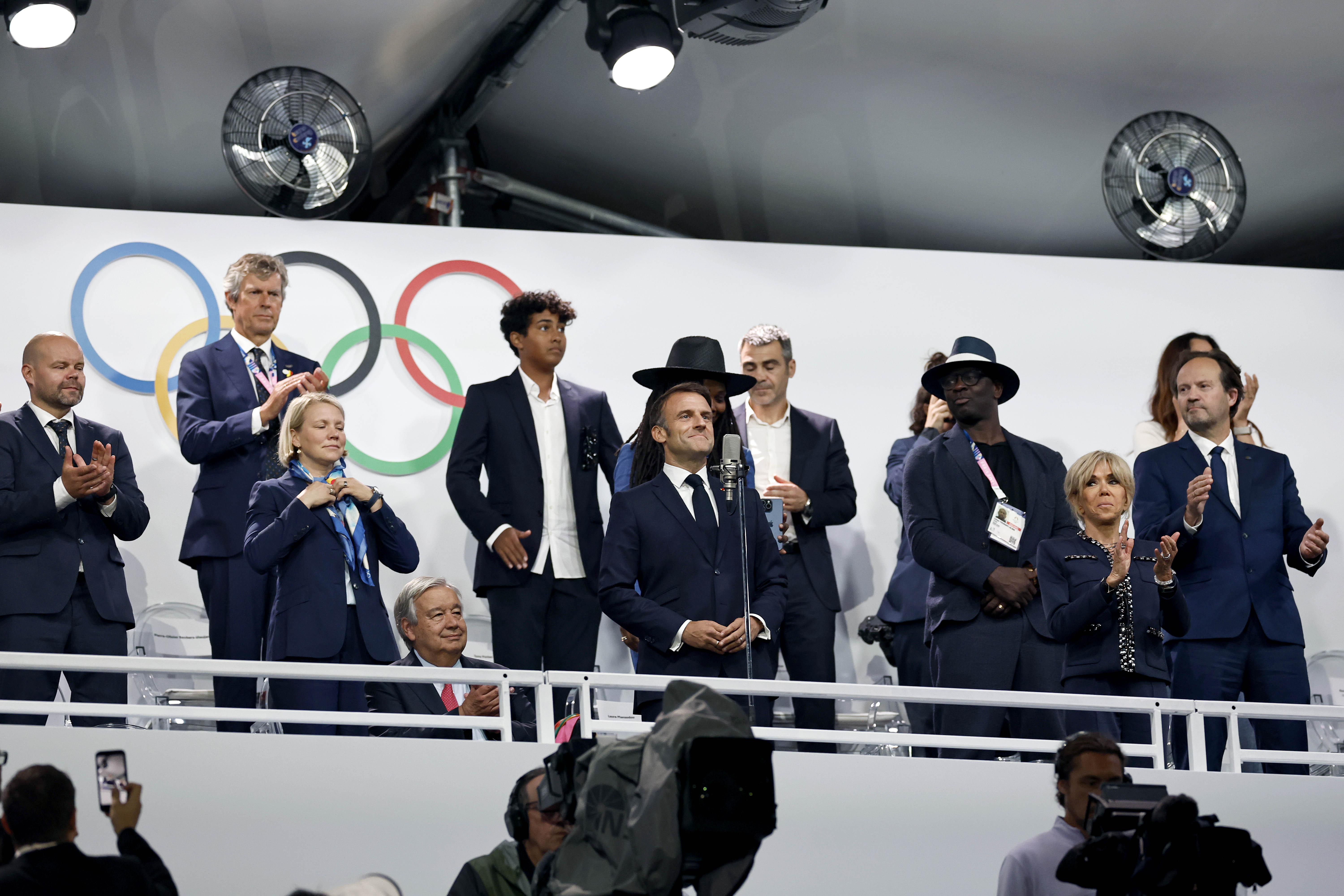 เริ่มต้นด้วยฉายภาพยนตร์ ซีเนอดีน ซีดาน อดีตนักเตะชุดแชมป์โลก 1998 ถือคบเพลิงก่อนส่งต่อให้เด็กน้อย 3 คน โดยมี เอ็มมานูเอล มาครง ประธานาธิบดีฝรั่งเศส และโธมัส บาค ประธานคณะกรรมการโอลิมปิกสากล หรือ ไอโอซี มาร่วมในพิธีเปิด