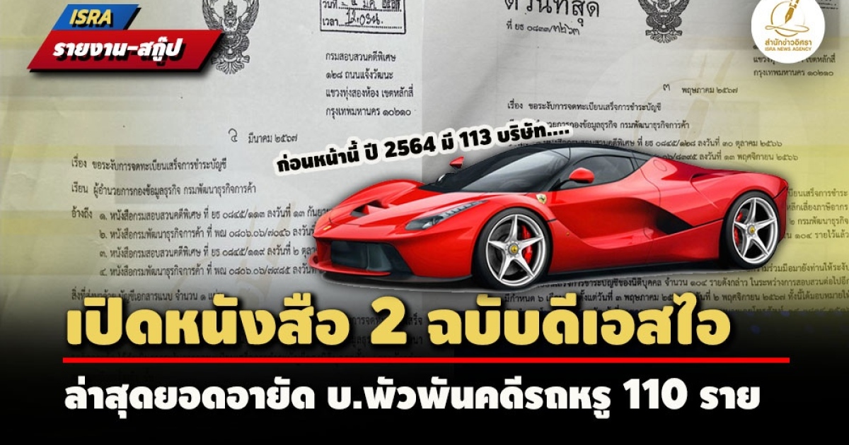 เปิดหนังสือ ดีเอสไอ 2 ฉบับ ลงนาม พ.ต.ท.เยาว์ ทองเสน รองอธิบดี ล่าสุด ขอให้กรมพัฒนาธุรกิจการค้า ระงับจดทะเบียนเสร็จการชำระบัญชีนิติบุคคล ยอดรวมล่าสุด 110 ราย พัวพันคดีนำเข้ารถหรู ก่อนหน้านี้ ปี 2564 มี 113 บริษัท