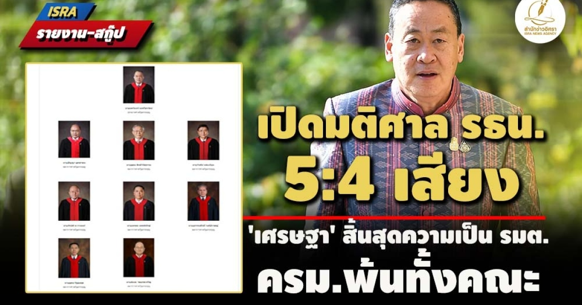 ดูชัด ๆ เปิดมติตุลาการศาล รธน. ข้างมาก 5 : 4 เสียง วินิจฉัยให้ 'เศรษฐา ทวีสิน' พ้นตำแหน่งนายกรัฐมนตรี พร้อมคณะรัฐมนตรีทั้งคณะ จากกรณีแต่งตั้ง 'พิชิต ชื่นบาน' เป็นรัฐมนตรีประจำสำนักนายกรัฐมนตรี