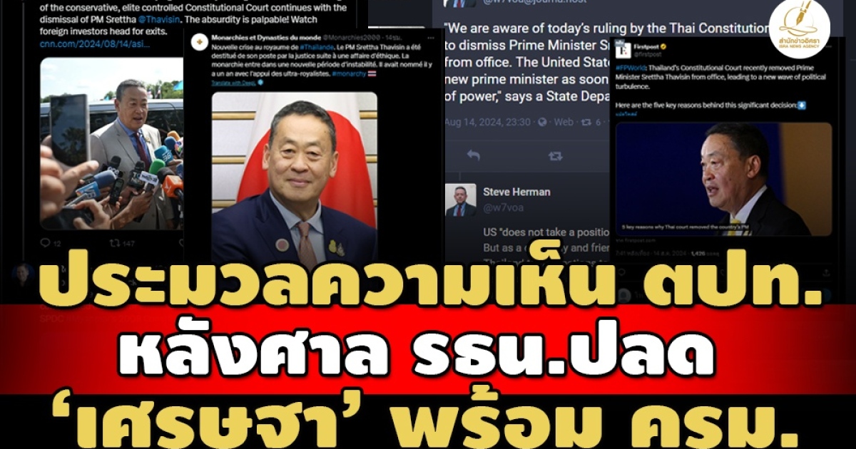 ขณะที่ทวิตเตอร์ของ Monarchies et Dynasties du monde ซึ่งเป็นนิตยสารที่รายงานข่าวเกี่ยวกับสถาบันกษัตริย์ทั่วโลกได้รายงานว่าอาจเกิดวิกฤติครั้งใหม่ในประเทศไทย เมื่อนายเศรษฐาถูกให้ออกจากตำแหน่งในคดีจริยธรรม นี่อาจจะเข้าสู่ช่วงเวลาของความไม่มั่นคงครั้งใหม่ หลังจากที่เมื่อปีก่อนนายเศรษฐาได้รับการสนับสนุนจากกลุ่มอนุรักษ์นิยมแบบสุดขั้ว