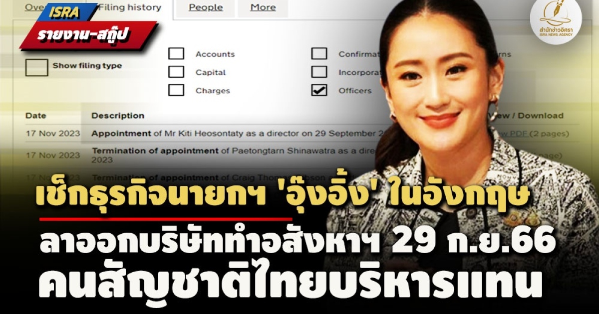 "...สำนักข่าวอิศรา ย้อนกลับไปตรวจสอบข้อมูลบริษัท MONTPELIER HALL MANAGEMENT COMPANY LIMITED เพิ่มเติมอีกครั้ง พบว่าความเปลี่ยนแปลงในช่วงปี 2566 คือ 1. นาย Stanislav Derev ลาออกจากผู้อำนวยการบริษัทเมื่อวันที่ 15 พ.ค. 2566 2. นาย Craig Thom as Gibson ลาออกจากผู้อำนวยการบริษัทวันที่ 31 ต.ค.2566 และ 3. น.ส.แพทองธาร ชินวัตร ลาออกจากผู้อำนวยการบริษัทวันที่ 29 ก.ย. 2566 และมีผู้อำนวยการเข้าใหม่ได้แก่ 1.นาย Kiti Heosontaty..."