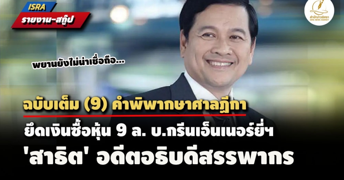 ในตอนนี้ จะขอนำเสนอข้อมูลเกี่ยวกับการยึดทรัพย์ เงินลงทุนในบริษัทกรีน เอ็นเนอร์ยี่ เทรดดิ้ง จํากัด จํานวน 90,000 หุ้น มูลค่า 9,000,000 บาท ซึ่งศาลฯ เห็นว่าพยานของนายสาธิต รังคสิริ ผู้ถูกกล่าวหา และ นายโสฬส รังคสิริ ผู้คัดค้านที่ 3 ไม่น่าเชื่อถือ ไม่อาจพิสูจน์ถึงแหล่งที่มาของเงินที่ใช้ซื้อหุ้นของบริษัทดังกล่าวตามที่อ้างได้ จึงเชื่อว่าเงินลงทุนข้อนี้เป็นทรัพย์สินของผู้ถูกกล่าวหาที่ได้มาจากการร่ำรวยผิดปกติ
