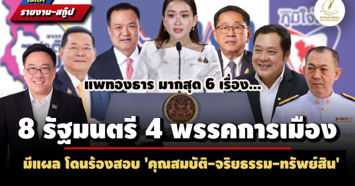 "...สำนักข่าวอิศรา ตรวจสอบข้อมูลรายชื่อรัฐมนตรีที่ถูกร้องเรียนเรื่องคุณสมบัติและจริยธรรม และการแจ้งข้อมูลบัญชีทรัพย์สินและหนี้ต่อ สำนักงานคณะกรรมการป้องกันและปราบปรามการทุจริตแห่งชาติ (ป.ป.ช.) ที่อาจนำไปขั้นตอนการสอบสวนในอนาคตได้ พบว่า มีรัฐมนตรีถึง 8 ราย จาก 4 พรรคการเมือง ขณะที่ตัว น.ส.แพทองธาร นายกฯ ถูกร้องเรียนมากสุด 6 เรื่อง..."