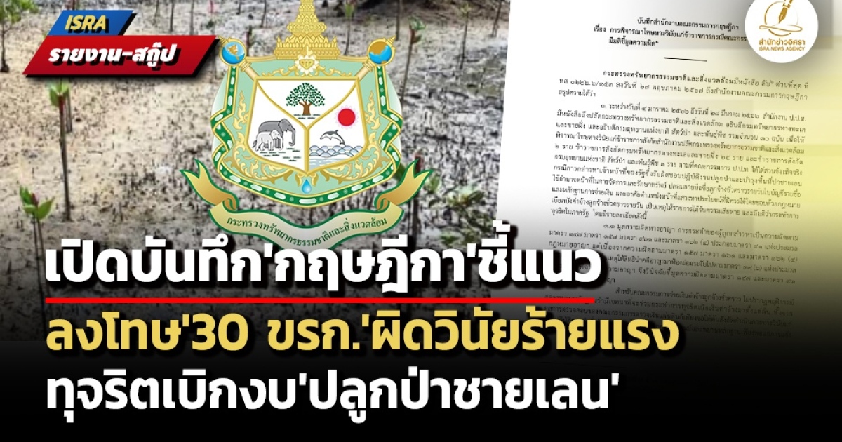 จากกรณีที่ คณะกรรมการป้องกันและปราบปรามการทุจริตในภาครัฐ (ป.ป.ท.) มีมติชี้มูลความผิด ‘ทางอาญาและทางวินัย’ ข้าราชการ 30 ราย ซึ่งสังกัดสำนักงานปลัดกระทรวงทรัพยากรธรรมชาติและสิ่งแวดล้อม กรมทรัพยากรทางทะเลและชายฝั่ง และกรมอุทยานแห่งชาติ สัตว์ป่า และพันธุ์พืช กรณีการทุจริตปลูกป่าชายเลนในพื้นที่ 3 จังหวัด ได้แก่ ตรัง กระบี่ และสตูล