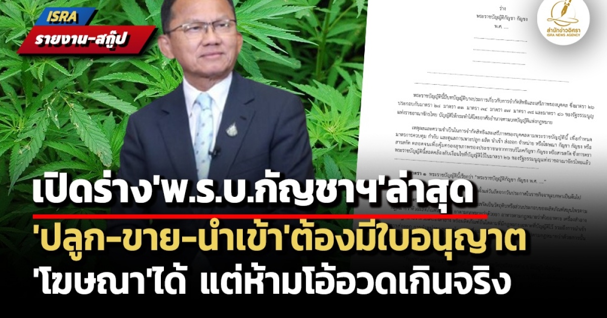 ล่าสุดเมื่อวันที่ 16 ก.ย.ที่ผ่านมา กรมการแพทย์แผนไทยและการแพทย์ทางเลือก กระทรวงสาธารณสุข (สธ.) ได้เปิดรับฟังความคิดเห็น ร่าง พ.ร.บ.กัญชา กัญชง พ.ศ. .... ซึ่งประกอบด้วย 77 มาตรา สำนักข่าวอิศรา (www.isranews.org) จึงขอนำเสนอสาระสำคัญของ ร่าง พ.ร.บ.ฉบับดังกล่าว มีรายละเอียดที่น่าสนใจ ดังนี้