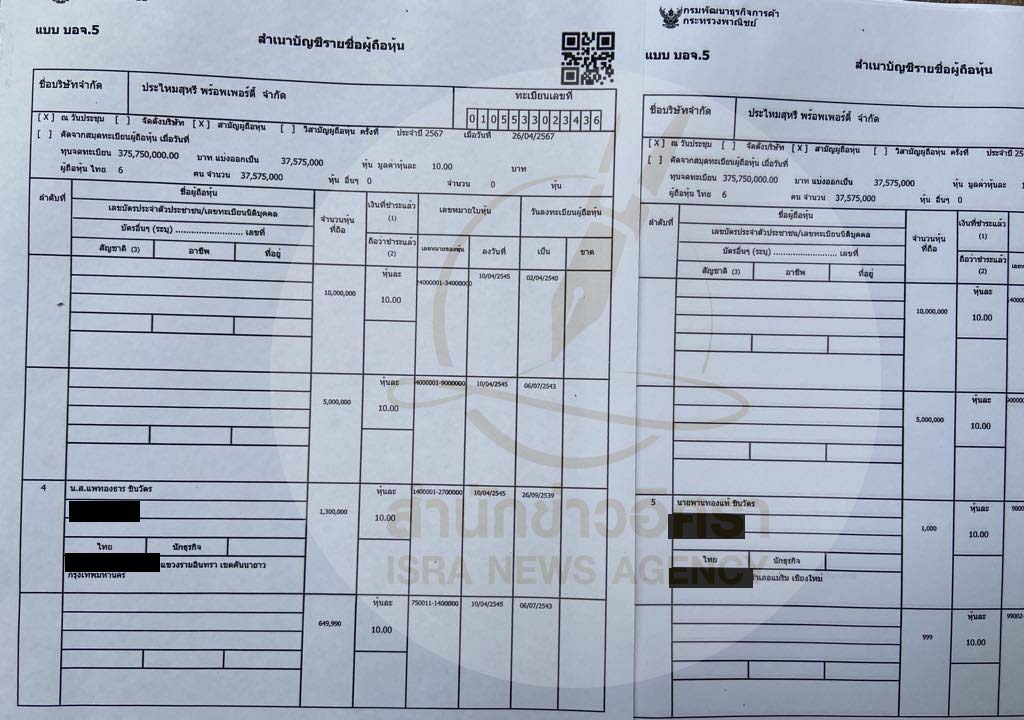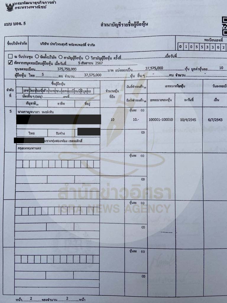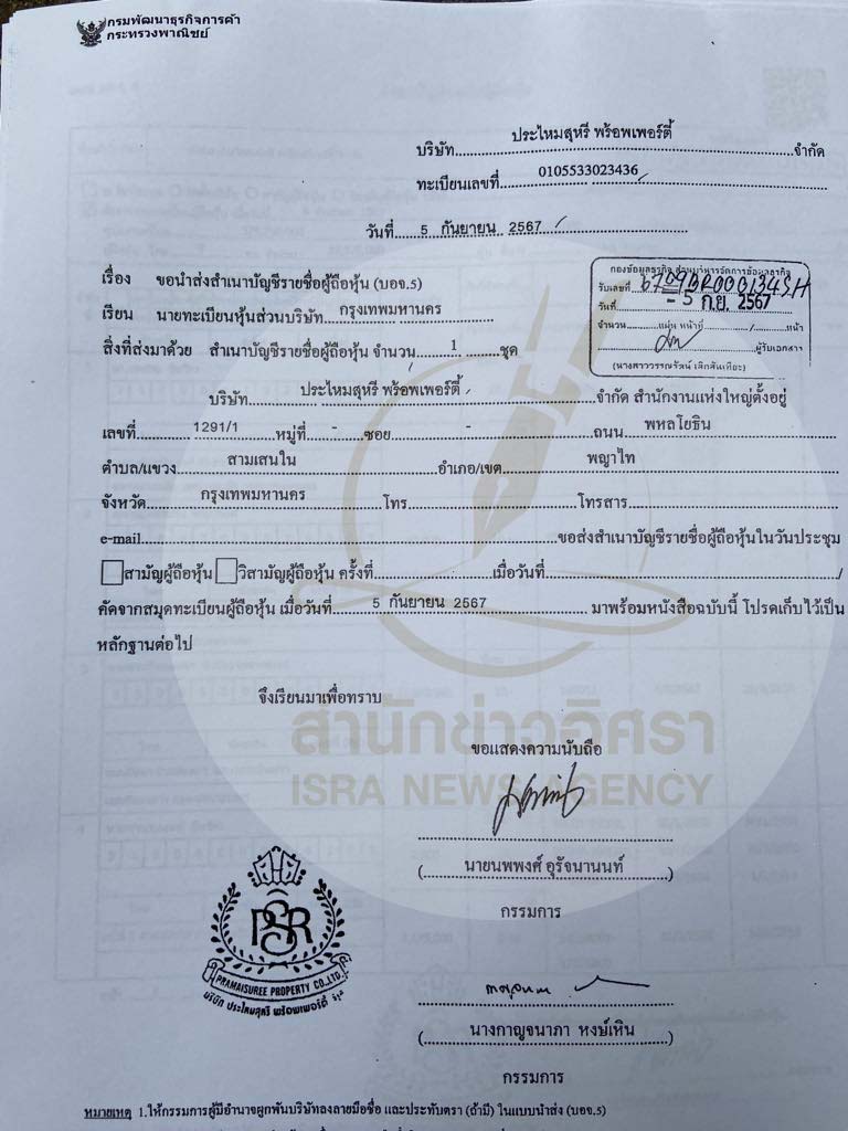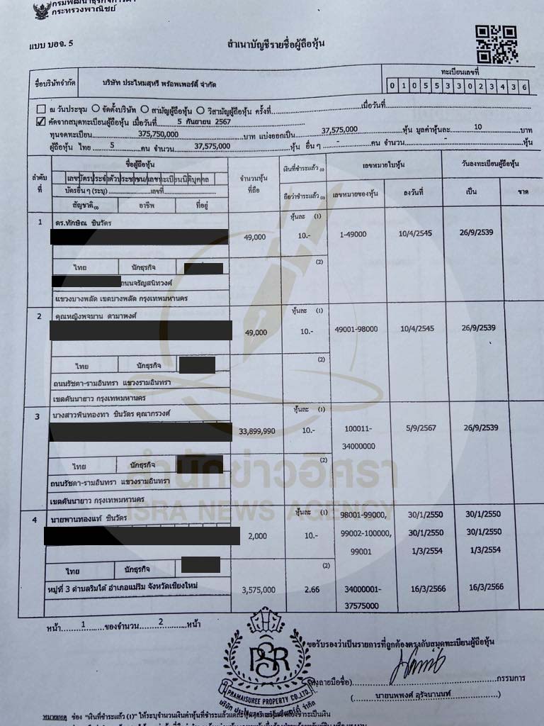 สำนักข่าวอิศรา (www.isranews.org) ตรวจสอบพบว่า เมื่อวันที่ 5 กันยายน 2567 บริษัท ประไหมสุหรี พร้อพเพอร์ตี้ จำกัด โดย นายนพพงศ์ อุรัจนานนท์ และนางกาญจนาภา หงษ์เหิน กรรมการ บริษัทฯ นำส่งสำเนาบัญชีรายชื่อผู้ถือหุ้น (บอจ.5) ต่อนายทะเบียนหุ้นส่วนบริษัทกรุงเทพมหานคร ระบุ คัดจากสมุดผู้ถือหุ้นเมื่อวันที่ 5 กันยายน 2567 มีผู้ถือหุ้น 5 คน