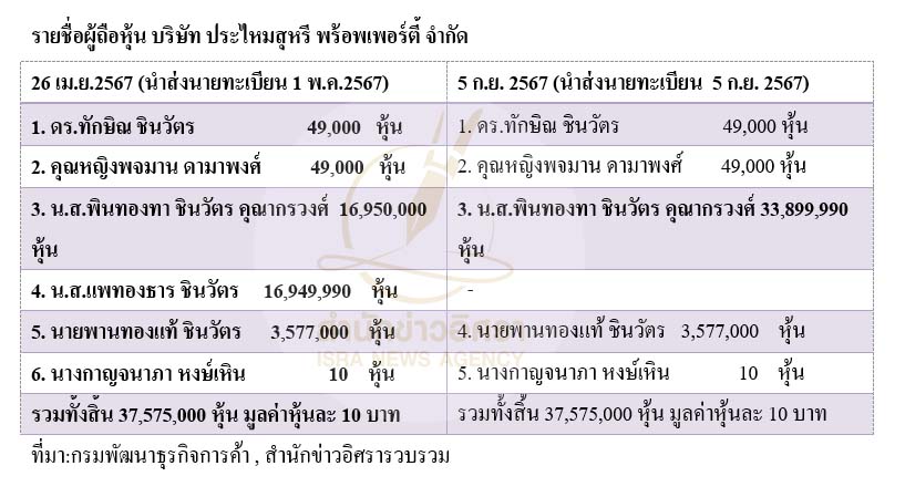 ก่อนหน้านี้ วันที่ 26 เม.ย.2567 (บริษัทฯนำส่งนายทะเบียน 1 พ.ค.2567) บริษัท ประไหมสุหรีฯ มีผู้ถือหุ้น 6 คน น.ส.พินทองทา ชินวัตร คุณากรวงศ์ จำนวน 16,950,000 หุ้น น.ส.แพทองธาร ชินวัตร 16,949,990 หุ้น (45.10%) นายพานทองแท้ ชินวัตร 3,577,000 หุ้น นายทักษิณ คุณหญิงพจมาน คนละ 49,000 หุ้น และนางกาญจนาภา 10 หุ้น