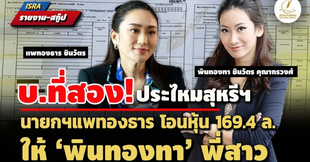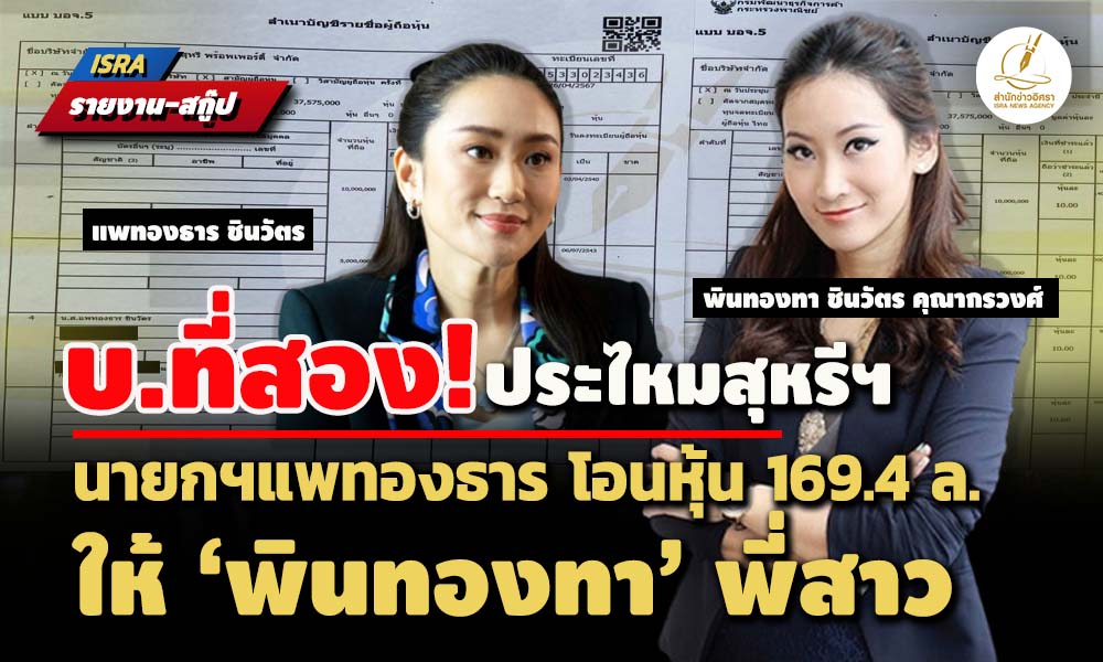 คราวนี้ บ.ที่สอง ! นายกฯ ‘อุ๊งอิ๊ง-แพทองธาร’ โอนหุ้น ประไหมสุหรี พร้อพเพอร์ตี้ 45.10% มูลค่า 169.4 ล้าน ให้ ‘เอม พินทองทา ชินวัตร’ พี่สาว หลังทิ้งสนามกอล์ฟอัลไพน์ฯ 224.1 ล. คุณหญิงพจมาน วันเดียว