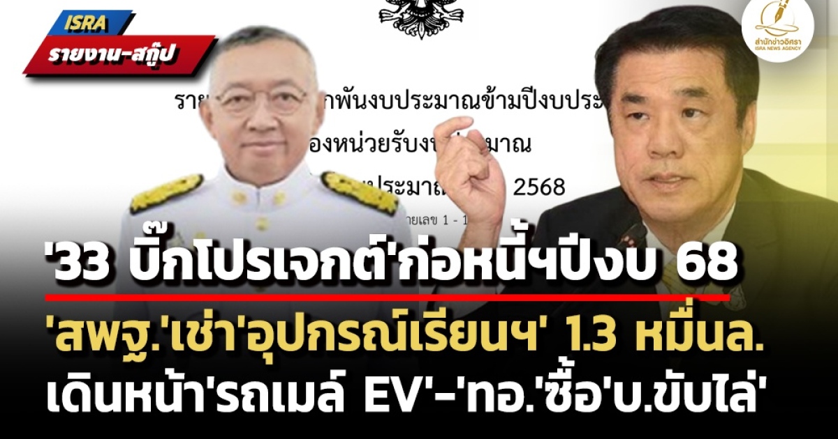 สำนักข่าวอิศรา (www.isranews.org) จึงขอนำเสนอรายการก่อหนี้ผูกพันข้ามปี งบประมาณรายการใหม่ ประจำปีงบประมาณ พ.ศ.2568 ในส่วนรายการที่มีวงเงินรวมตั้งแต่ 1,000 ล้านบาทขึ้นไป จำนวน 33 รายการ ดังนี้