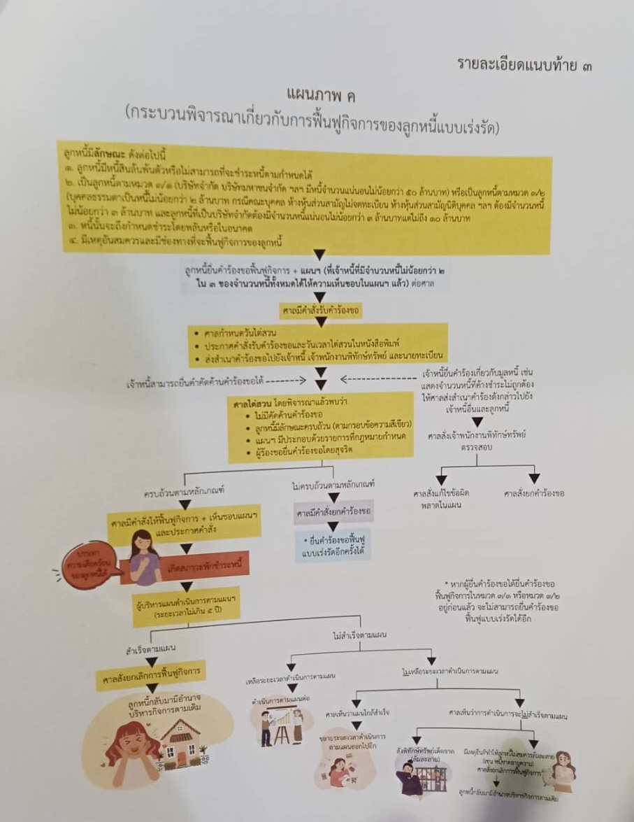 โดยมีประเด็นสำคัญ คือ การให้ลูกหนี้เป็นผู้จัดทำและบริหารแผนฟื้นฟูกิจการ และมีการกำหนดให้ศาลสามารถมีคำสั่งฟื้นฟูฐานะได้ทันที ในกรณีที่ลูกหนี้ยื่นคำร้องขอฟื้นฟูฐานะด้วยตนเอง ซึ่งเป็นการเปิดโอกาสให้ประชาชนทั่วไปสามารถฟื้นฟูฐานะและกิจการของตนเองได้อย่างทันท่วงทีและทั่วถึงมากยิ่งขึ้น โดยมีขั้นตอนพอสังเขปปรากฏตามรายละเอียดแนบท้าย 4