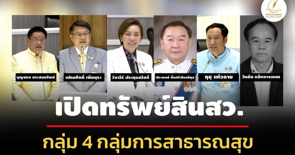 สำนักข่าวอิศรา (www.isranews.org) รายงานว่า เมื่อวันที่ 21 พ.ย. 2567 สำนักงานคณะกรรมการการป้องกันและปราบการทุจริตแห่งชาติ (ป.ป.ช.) เปิดเผยบัญชีแสดงรายการทรัพย์สินและหนี้สินของสมาชิกวุฒิสภา (สว.) กลุ่มที่ 4 กลุ่มการสาธารณสุข กรณีเข้ารับตำแหน่งเมื่อวันที่ 23 ก.ค. 2567 โดยรายชื่อที่ได้รับการเปิดเผยรายการทรัพย์สินและหนี้สิน ได้แก่ 1.นายประพนธ์ ตั้งศรีเกียรติกุล 2.นายบุญชอบ สระสมทรัพย์ 3.นายวันชัย แข็งการเขตร 4.นางสาววิธาวีร์ ประทุมสวัสดิ์ 5.นายฤชุ แก้วลาย 6.นายเปรมศักดิ์ เพียยุระ