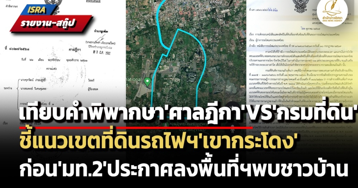 สำนักข่าวอิศรา (www.isranews.org) จึงขอนำคำพิพากษาของ ‘ศาลฎีกา’ ที่ได้วินิจฉัยเกี่ยวกับแนวเขตที่ดินรถไฟฯบริเวณ ‘แยกเขากระโดง’ มาให้สาธารณชนได้รับทราบอีกครั้ง โดยเปรียบเทียบกับ ‘ความเห็น’ ของ 'คณะกรรมการสอบสวน' ตามมาตรา 61 แห่งประมวลกฎหมายที่ดิน 'กรมที่ดิน' ที่มีความเห็นเกี่ยวกับแนวเขตที่ดินรถไฟฯบริเวณแยกเขากระโดง มีรายละเอียด ดังนี้