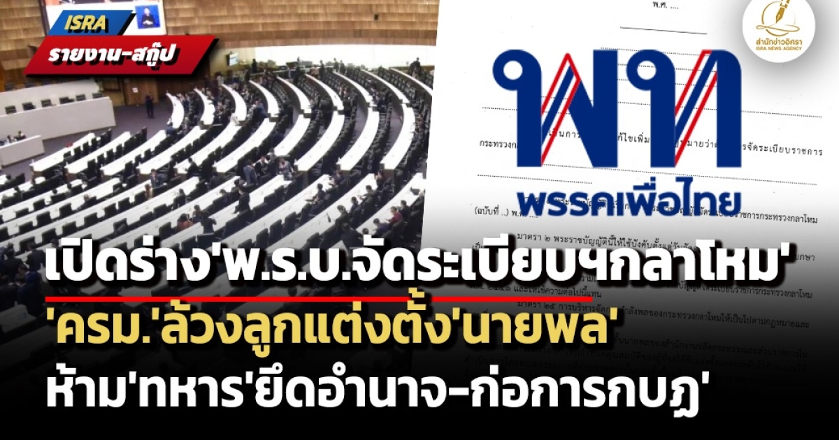 สำนักข่าวอิศรา (www.isranews.org) จึงขอนำเสนอ ‘หลักการ’ และ ‘เนื้อหา’ ของร่าง พ.ร.บ.จัดระเบียบราชการกระทรวงกลาโหม (ฉบับที่ ..) พ.ศ. .... ที่เสนอโดย ประยุทธ์ ศิริพานิชย์ สส.บัญชีรายชื่อ พรรคเพื่อไทยกับคณะ มีรายละเอียด ดังนี้