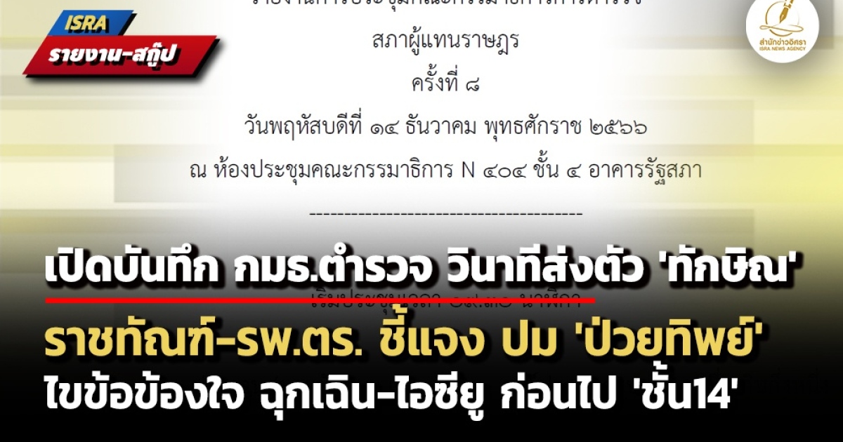 สำนักข่าวอิศรา (www.isranews.org) ขอนำรายงานการบันทึกชวเลขการการให้ข้อมูลของ 3 ใน 12 ราย ที่คณะกรรมการ ป.ป.ช.ตั้งองค์คณะไต่สวน โดยได้ชี้แจงต่อคณะกรรมาธิการการตำรวจ สภาผู้แทนราษฎร ครั้งที่ 8 เมื่อวันที่ 14 ธันวาคม 2566 และครั้งที่ 9 เมื่อวันที่ 21 ธันวาคม 2566 กรณีเรื่องร้องเรียนของนายวัชระ เพชรทอง อดีต สส.กทม.พรรคประชาธิปัตย์ ซึ่งได้เชิญตัวแทนจากกรมราชทัณฑ์ ผู้แทนโรงพยาบาลตำรวจมาชี้แจง ได้แก่ พลตำรวจตรี สามารถ ม่วงศิริ นายแพทย์ สบ.7 โรงพยาบาลตำรวจ นายนัสที ทองประหลาด ผู้บัญชาการเรือนจำพิเศษ กรุงเทพมหานคร และนายสิทธิ สุธีวงศ์ รองอธิบดีกรมราชทัณฑ์ในขณะนั้น มาให้สอบถามข้อมูลต่อกมธ.ตำรวจ