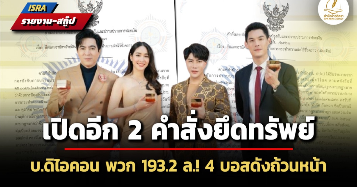 ใครเป็นใคร? เปิดรายละเอียดอีก 2 คำสั่ง ปปง.ยึดอายัดทรัพย์ บ.ดิไอคอน กรุ๊ป พวก 129 รายการ 193.2 ล คนดังโดนถ้วนหน้า บอสพอล วรัตน์พล 38.9 ล. - กันต์ กันตถาวร พ่วงเมีย 24 รายการ 17.8 ล. – มิน พีชญา ลิ่ว 31.6 ล. แซม ยุรนันท์ 2.6 ล. ก่อนหน้า 2 ครั้ง 127 ล.