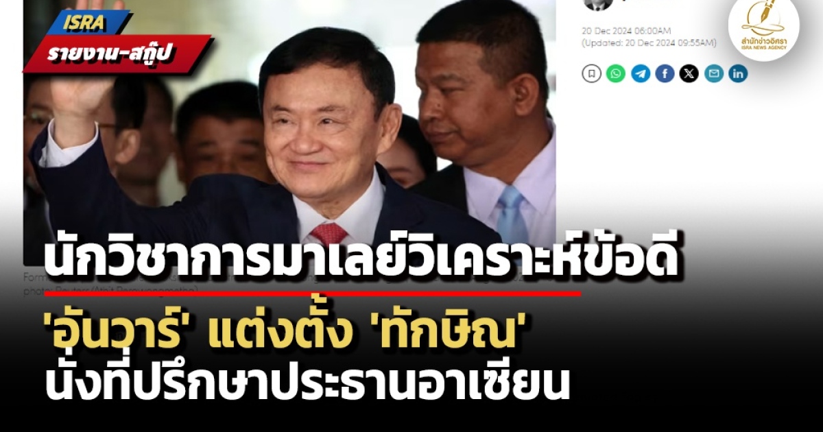 นับตั้งแต่วันที่ 16 ธ.ค.ที่ผานมา ที่นายอันวาร์ อิบราฮิม นายกรัฐมนตรีมาเลเซียได้มีการแต่งตั้งนายทักษิณ ชินวัตร อดีตนายกรัฐมนตรีไทย ให้เป็นที่ปรึกษาประธานอาเซียน มีผลตั้งแต่ปี 2568 เป็นต้นไป โดยนายทักษิณจะทำงานร่วมกับกลุ่มที่ปรึกษาที่เป็นอดีตนักการเมืองจากประเทศต่างๆ