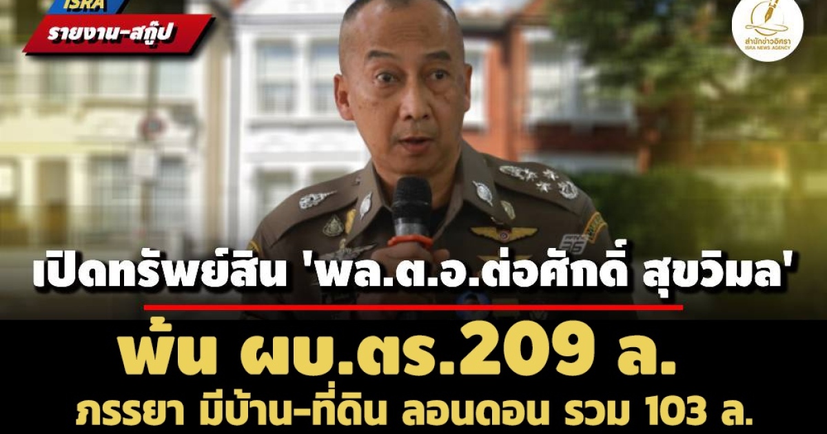 ป.ป.ช. เปิดทรัพย์สินผู้ดำรงตำแหน่งระดับสูง 'พล.ต.อ.ต่อศักดิ์ สุขวิมล' อดีตผู้บัญชาการตำรวจแห่งชาติ ทรัพย์สิน 209 ล. เงินฝาก 10 ล. รายได้ 5 ล./ปี-ภรรยา 'นิภาพรรณ สุขวิมล' มีบ้าน-ที่ดินในลอนดอน รวม 103 ล.