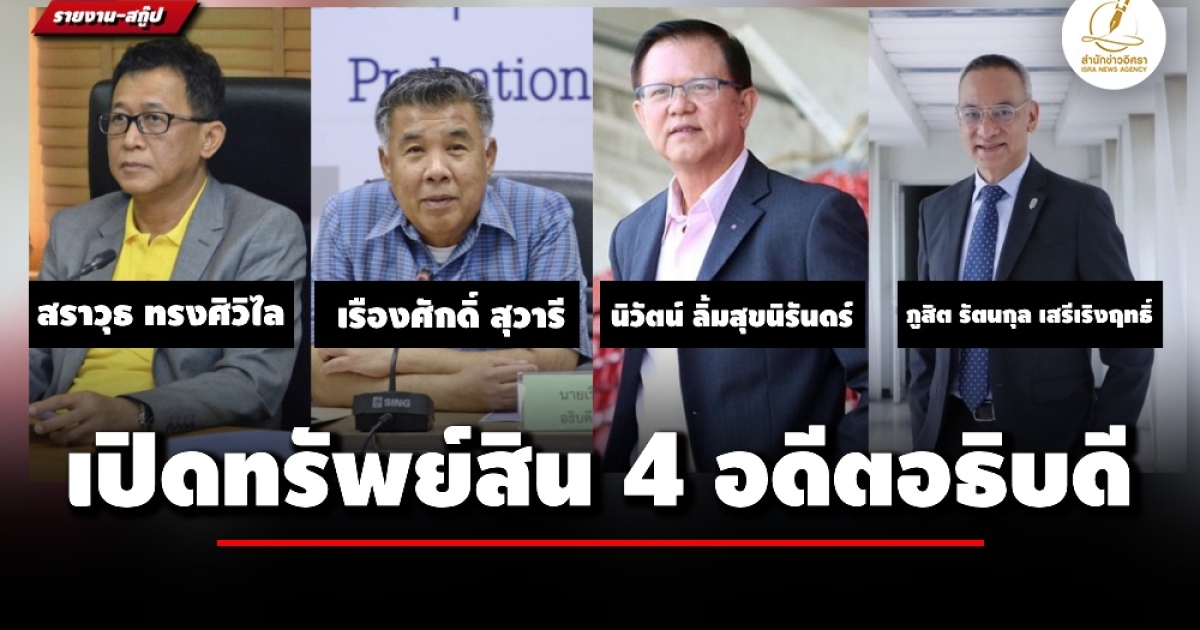 ป.ป.ช.เปิดทรัพย์สิน 4 อดีตอธิบดี 'เรืองศักดิ์ สุวารี' อดีตอธิบดีกรมคุมประพฤติมากสุด 208 ล.-'ภูสิต รัตนกุล เสรีเริงฤทธิ์' อดีตอธิบดีกรมส่งเสริมการค้าระหว่างประเทศ 193 ล.-'นิวัตน์ ลิ้มสุขนิรันดร์' อดีตอธิบดีกรมพลศึกษา 122 ล.-'สราวุธ ทรงศิวิไล' อดีตอธิบดีกรมทางหลวง 35 ล.