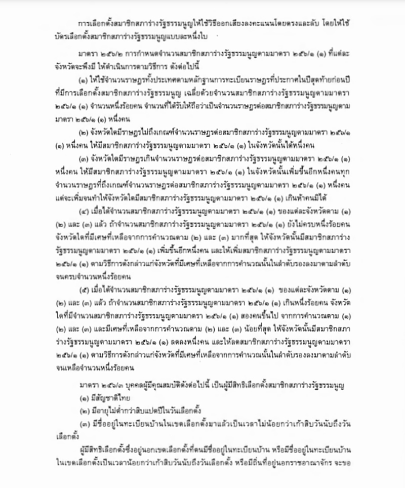 - กำหนดวิธีดำเนินการเพื่อกำหนดจำหนดจำนวนสมาชิกสภาร่างรัฐธรรมนูญแบบแบ่งเขตเลือกตั้งที่แต่ละจังหวัดจะพึงมี (มาตรา 256/2)