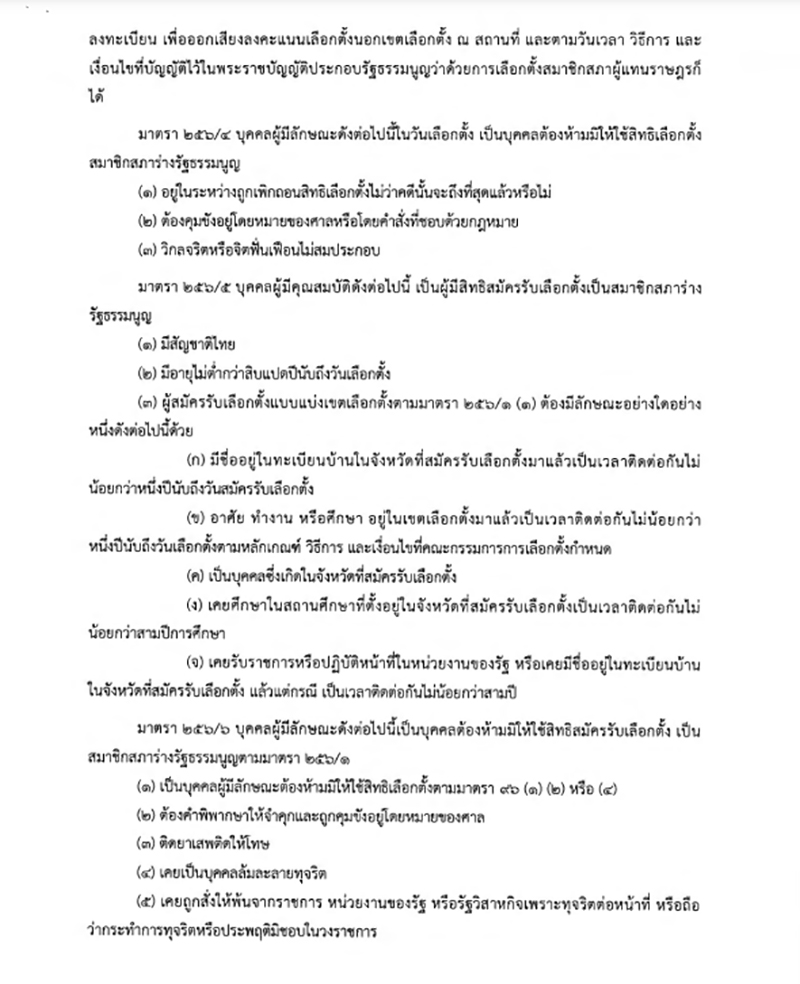 - กำหนดลักษณะต้องห้ามของผู้มีสิทธิเลือกตั้งสมาชิกสภาร่างรัฐธรรมนูญ (มาตรา 256/4)